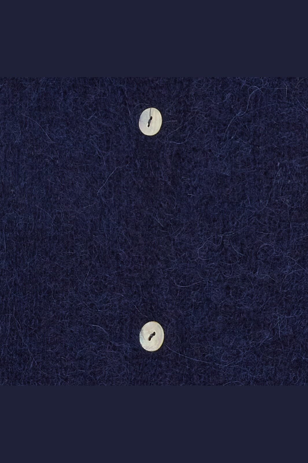 Mörkblå stickad cardigan från Marta Du Chateau med rund halsringning och knappar längs framsidan. Cardiganen har 3/4-ärmar med samlade manschetter.