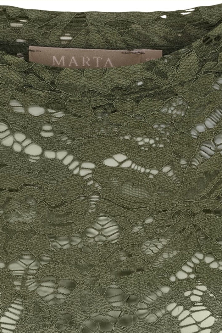 Långärmad t-shirt från Marta Du Chateau i militärgrönt med ett blommigt spetsmönster över hela blusen. Blusen har en rund halsringning och skulpterade kanter.