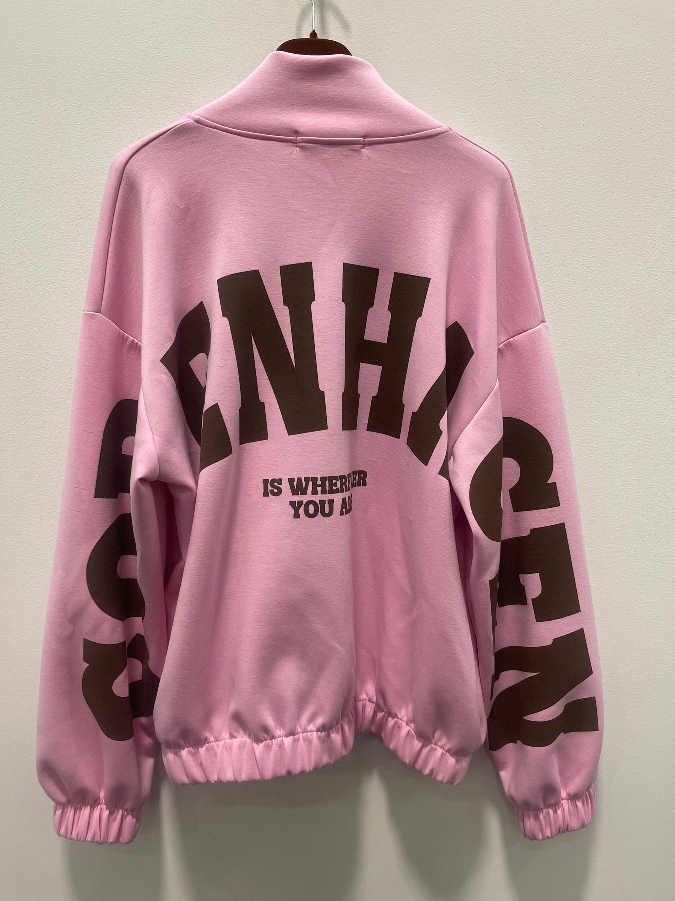 Rosa kofta från Marta Du Chateau med brunt texttryck. Koftan har hög krage och dragkedja framtill i en rosa/brun färgkombination.