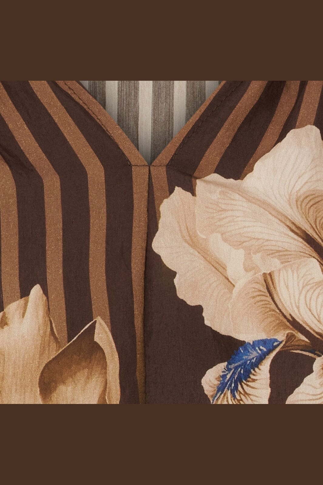 Skjorta från Marta Du Chateau, tillverkad av 100 % viskos med ett blommönster i beige och blå nyanser på en brun bakgrund. De vertikala ränderna ger visuell struktur.