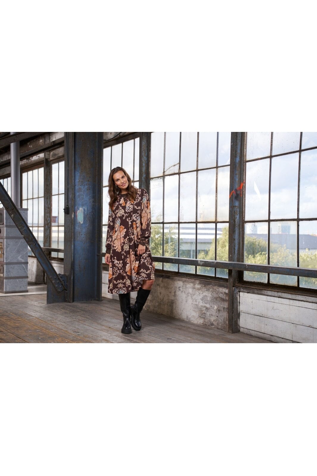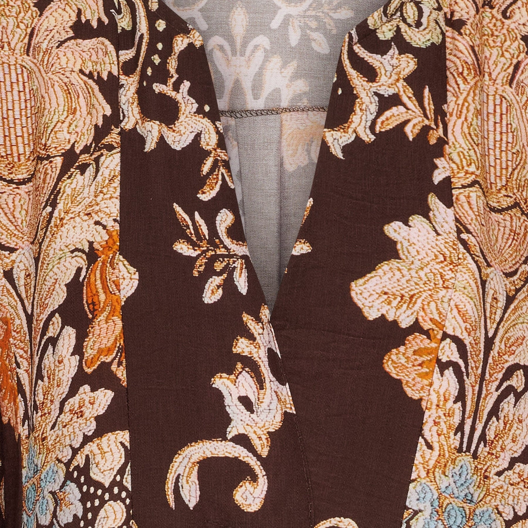 Brun klänning från Marta Du Chateau med blommigt och paisleymönster i nyanser av orange och blå. Klänningen har V-ringning, 3/4 ärmar och en lös passform.
