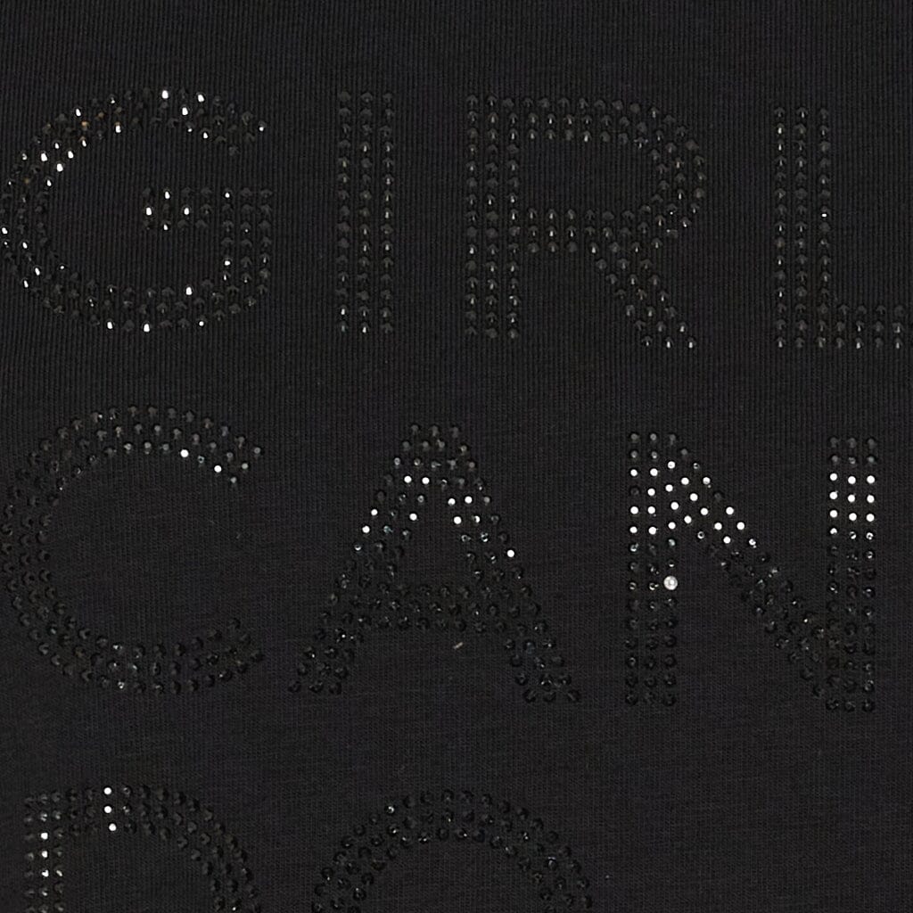 Svart T-shirt från Marta Du Chateau med texten GIRLS CAN DO ANYTHING i små, glittrande paljetter på framsidan. T-shirten passar både för avslappnad vardagsbruk och hemmabruk.