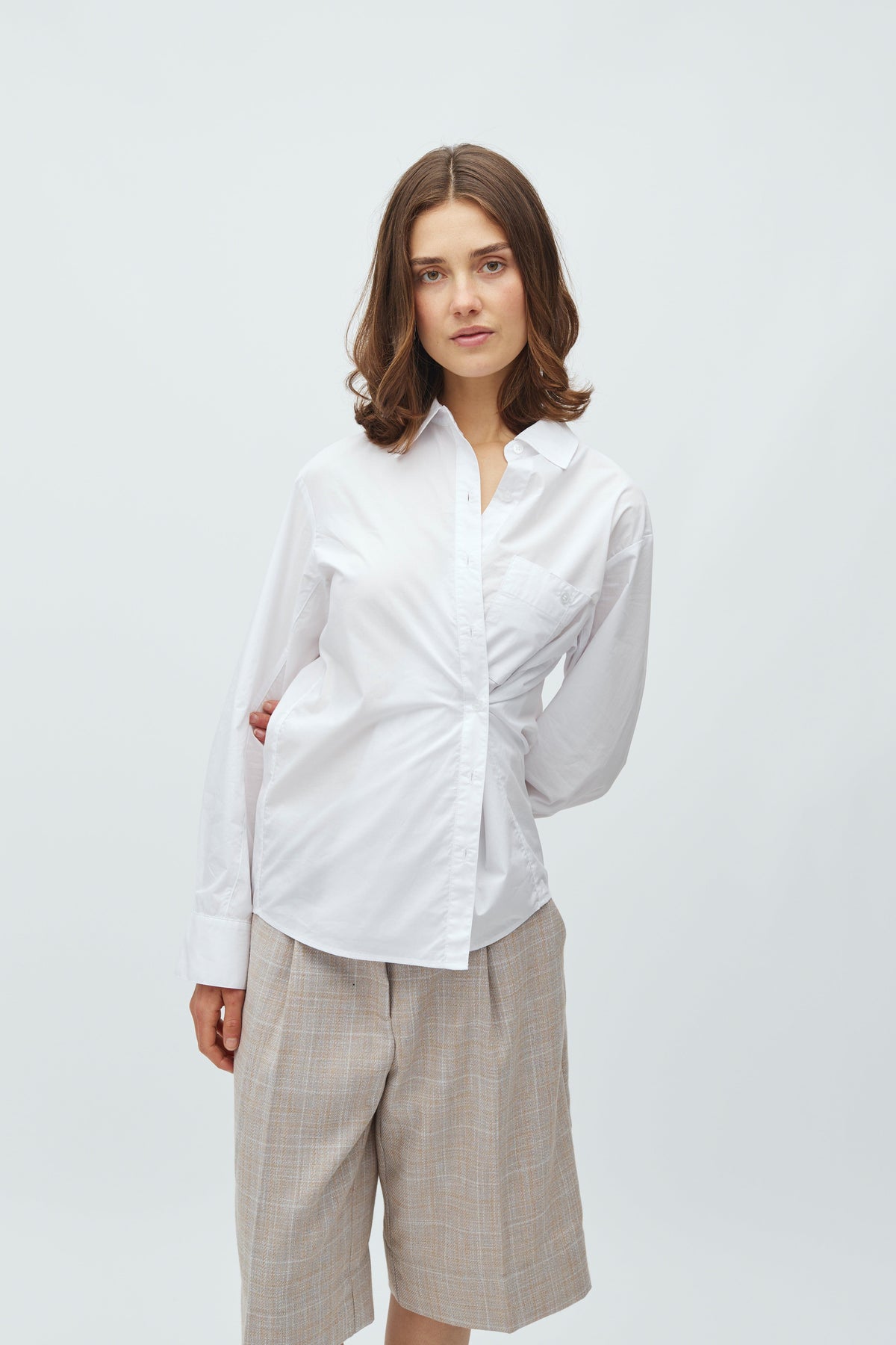 Vit skjorta från MbyM, tillverkad av 100 % bomull. Skjortan har långa ärmar, skjortkrage och knäppning, och den passar både för formella och avslappnade tillfällen.