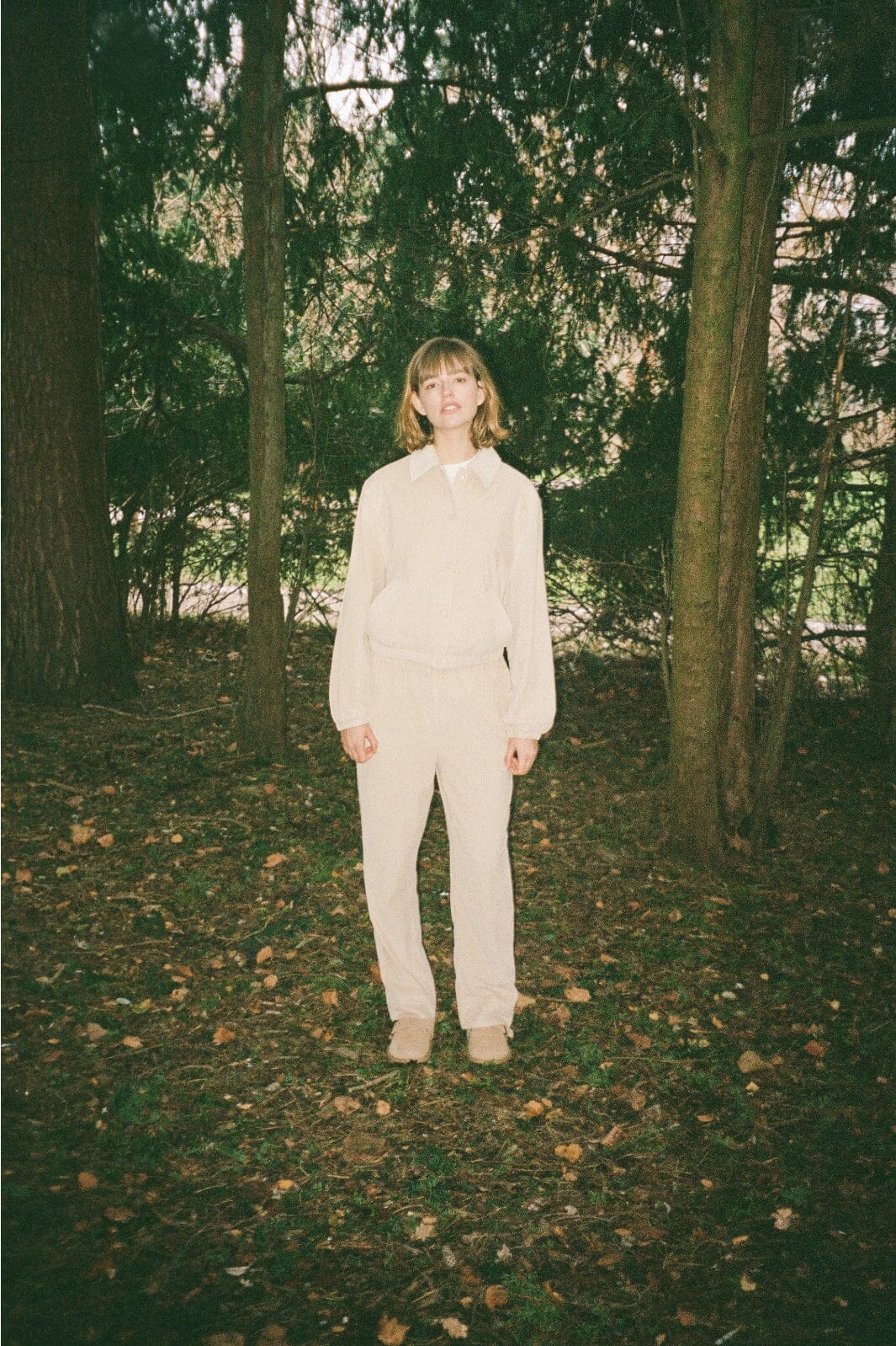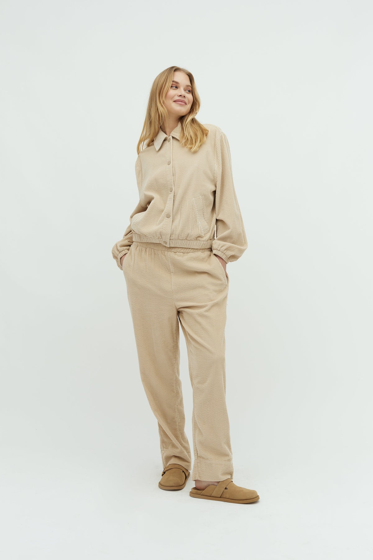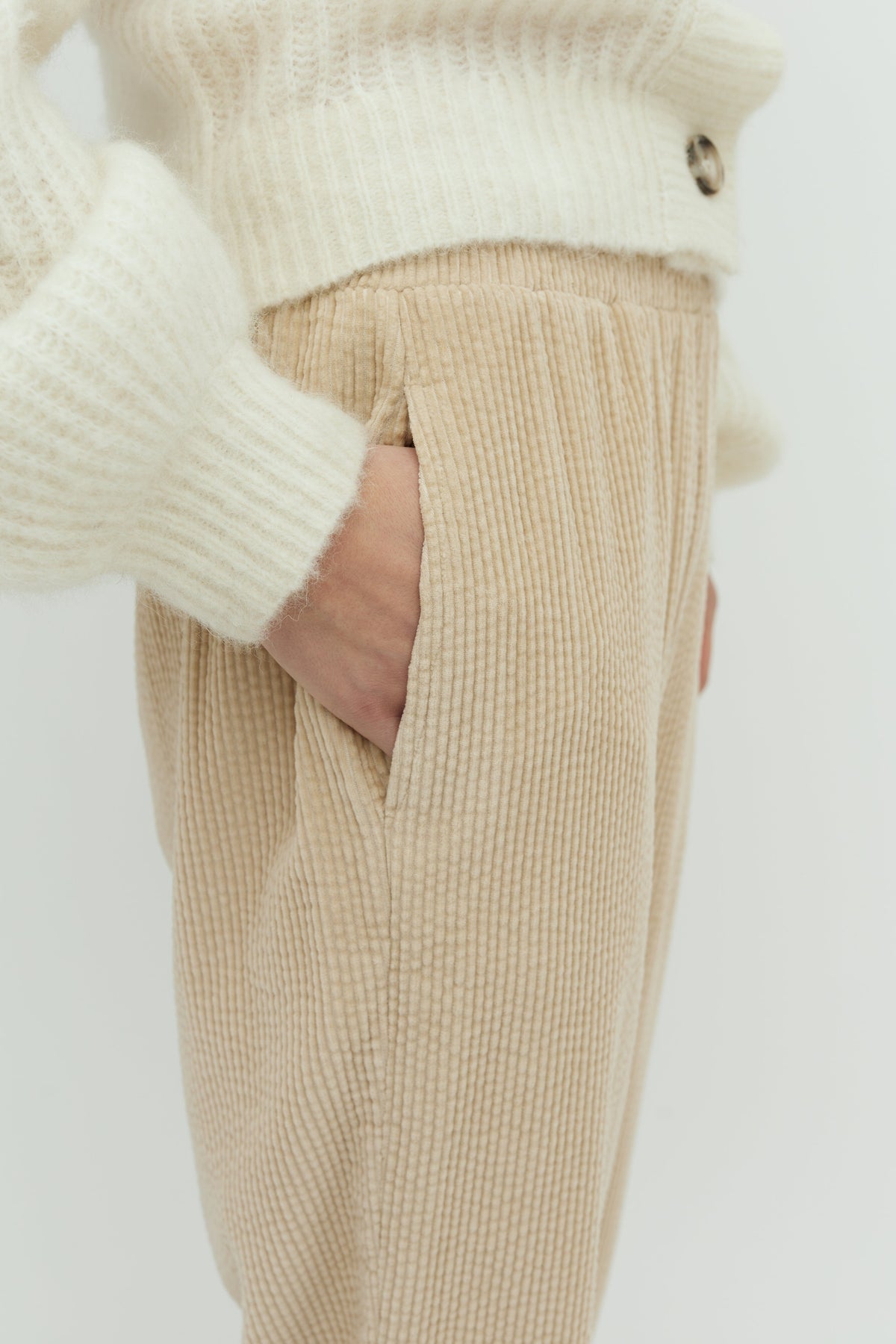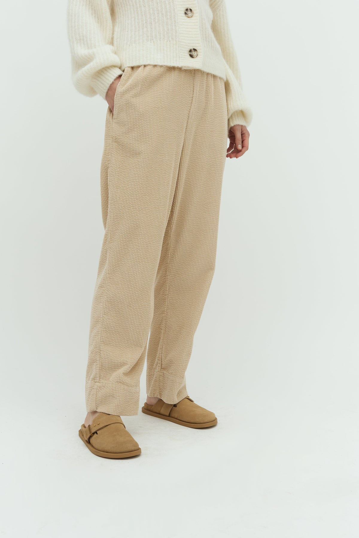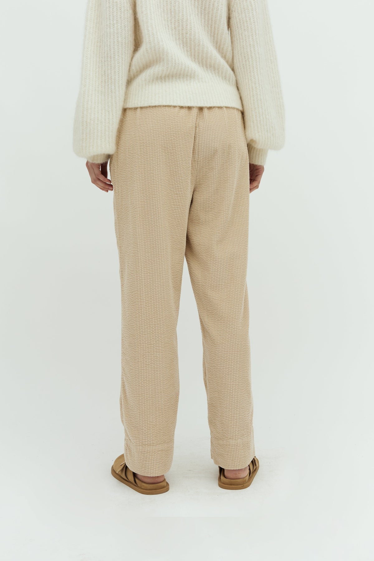 Beige byxor från MbyM i strukturerad bomull med elastisk midja. Byxorna har en rak ben-design och går till ankeln. De är designade för både hemmabruk och vardagen.