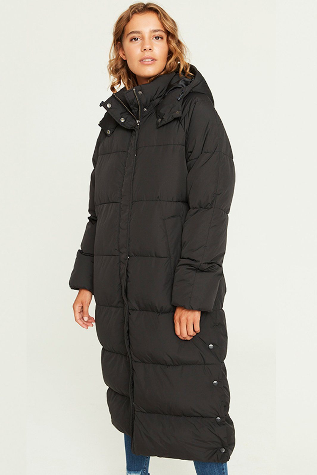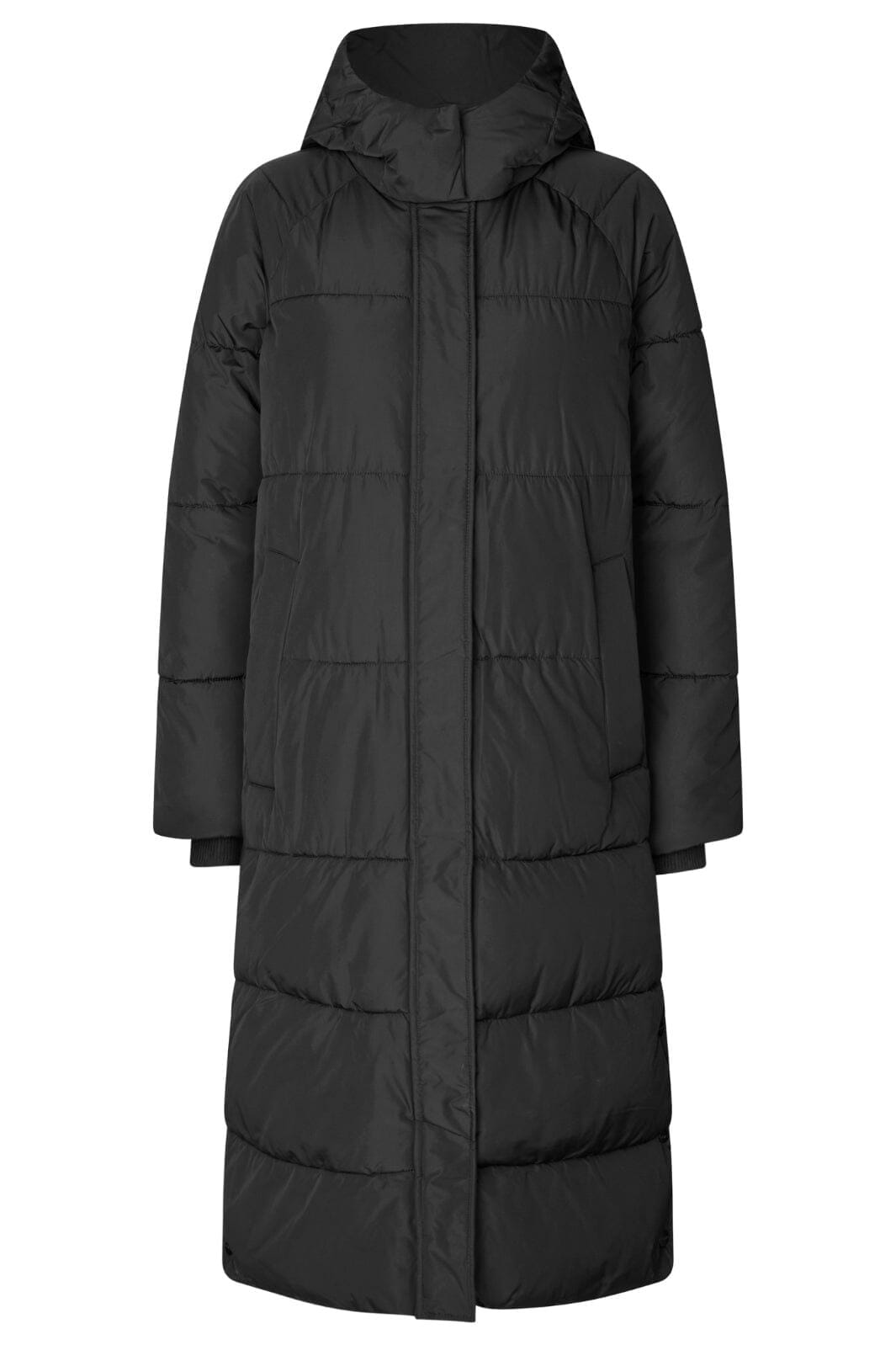 Härlig vinterjacka från mbyM i svart. Jacka med avtagbar huva som kan justeras runt huvudet, stängs med dragkedja och tryckknappar, härliga stora fodrade fickor på sidorna. Jackan har svarta tryckknappar längst ner på sidorna, vilket gör det enkelt när man cyklar eller kör bil. Jackan går ner till mitten av skenbenet. Jackan har ett polyesterfyllning - i en version som kallas ''falsk dun'' eftersom det är så luftigt och ser ut som dun från utsidan av tyget.