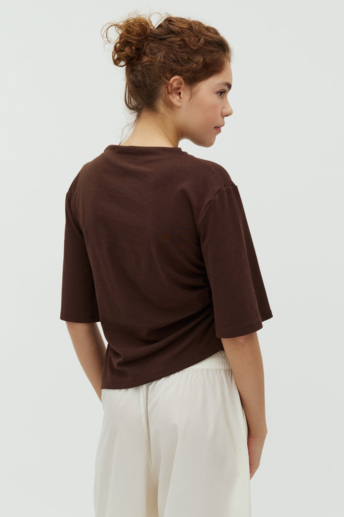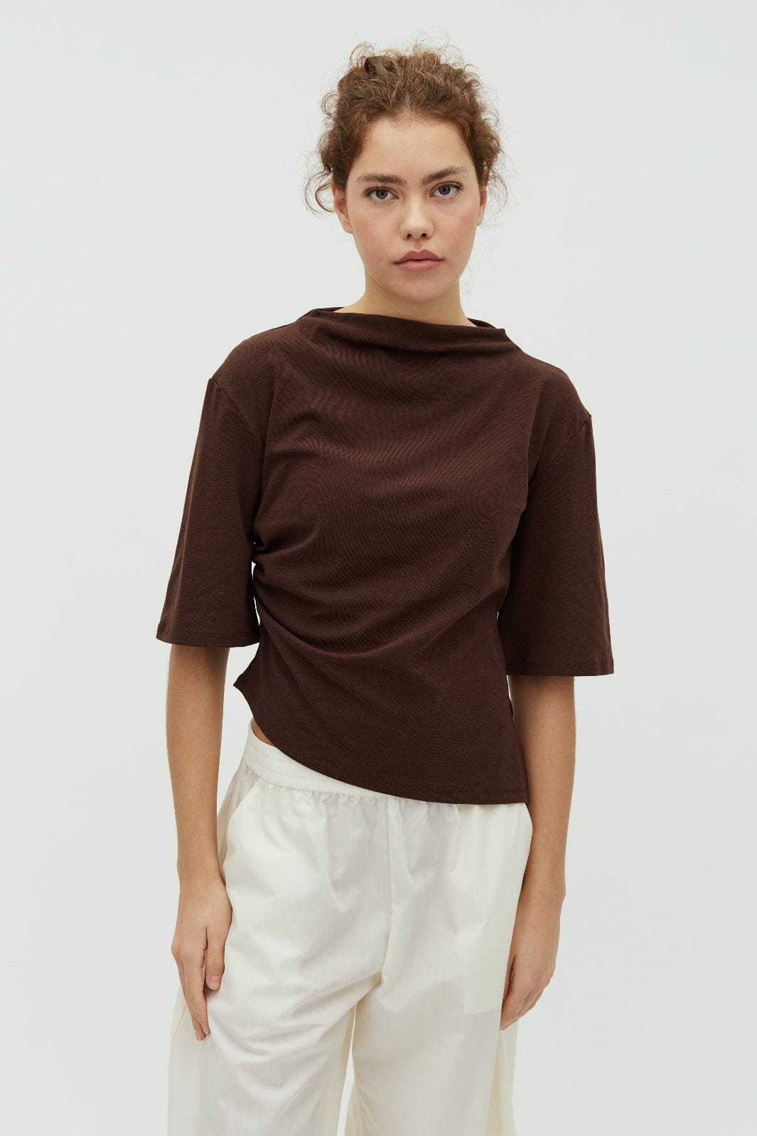 Brun blus från MbyM med hög hals och halvlånga ärmar. Blusen har en asymmetrisk kant och en lätt rynkad detalj på sidan.