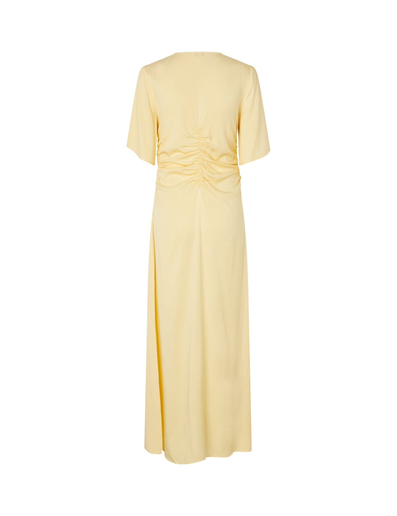 Gul klänning från MbyM i färgen Summer Yellow. Klänningen har rynkade detaljer och en V-ringning.