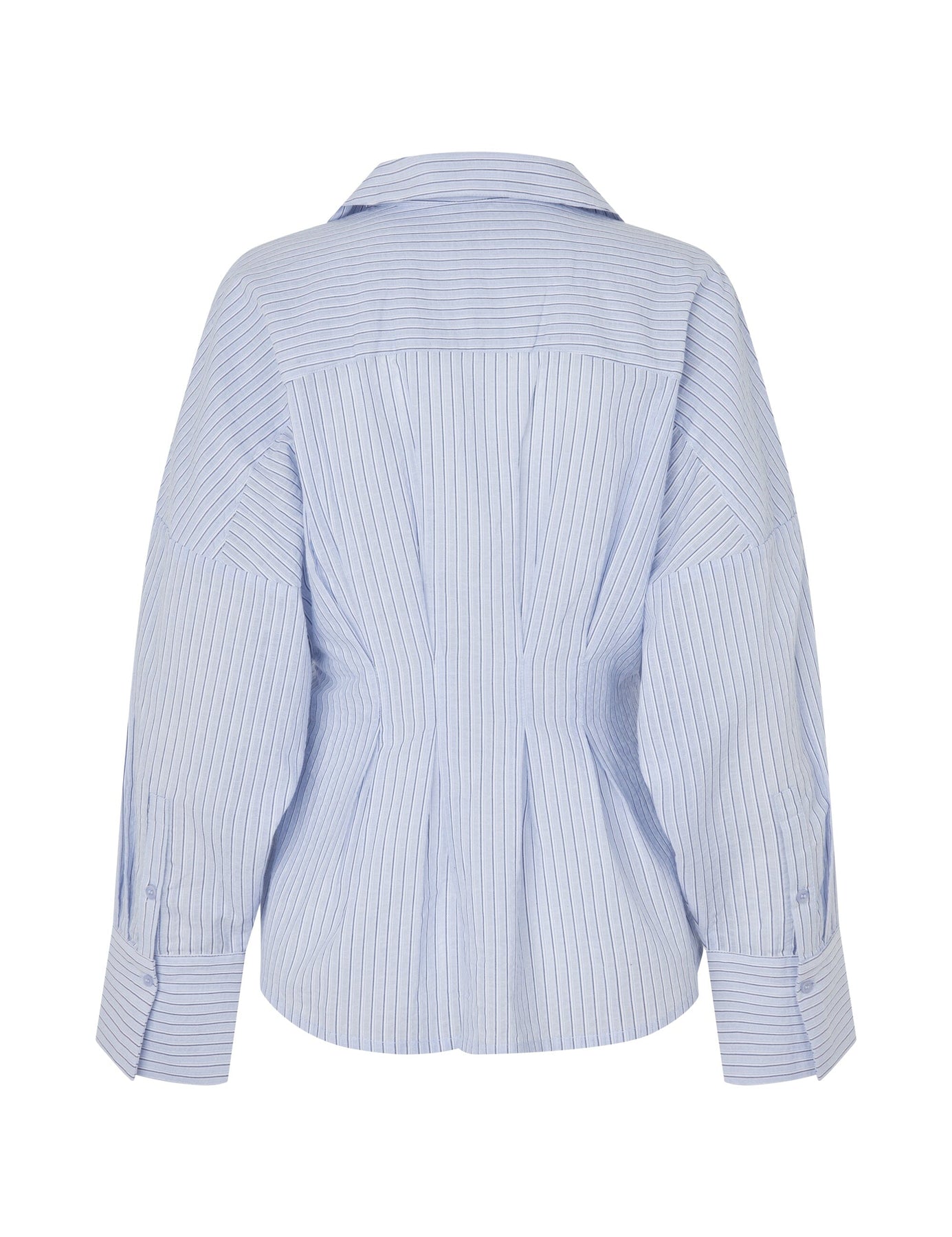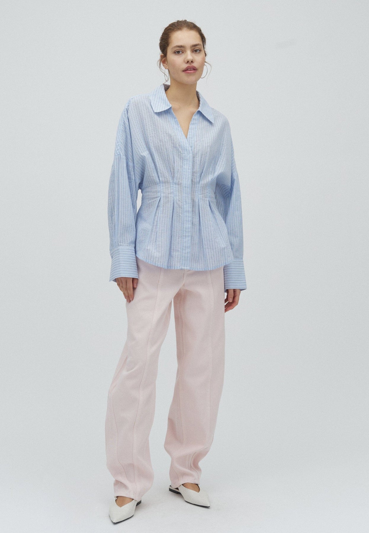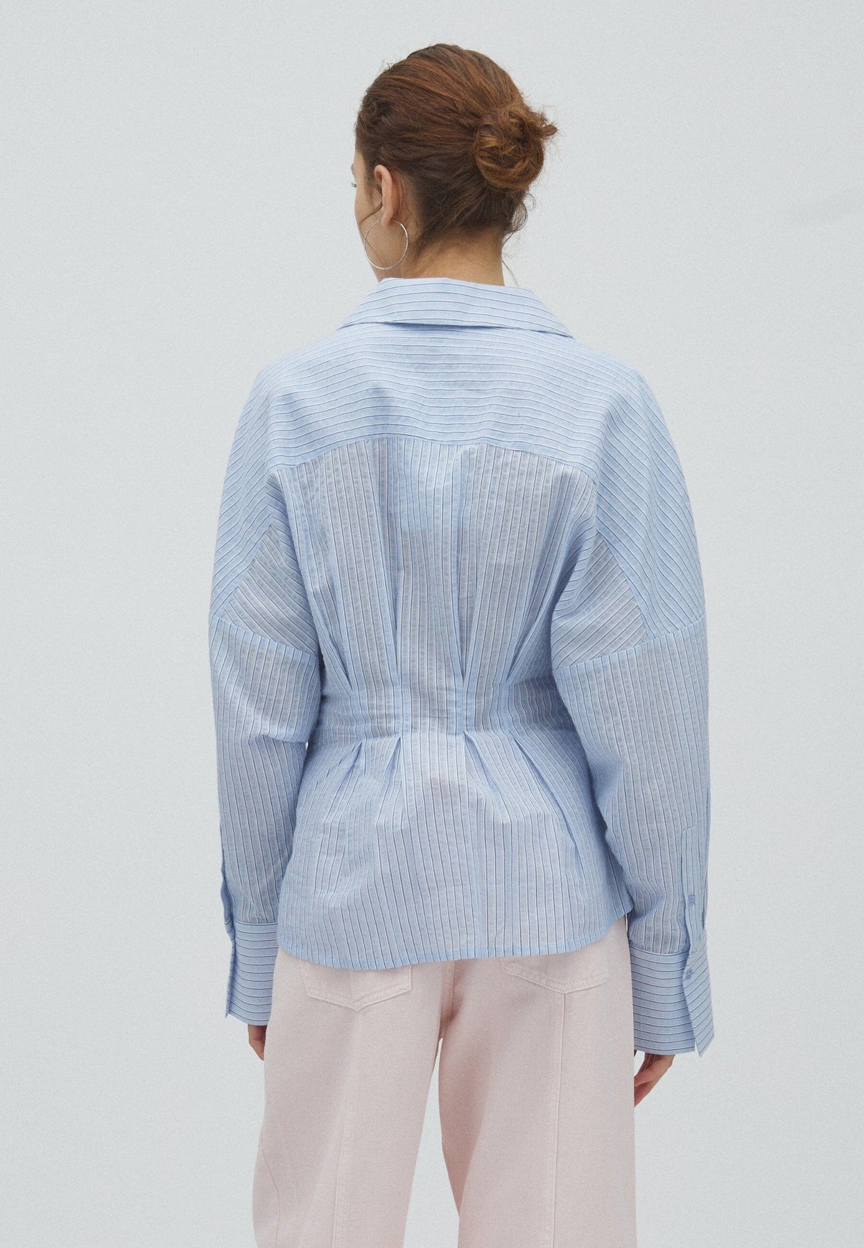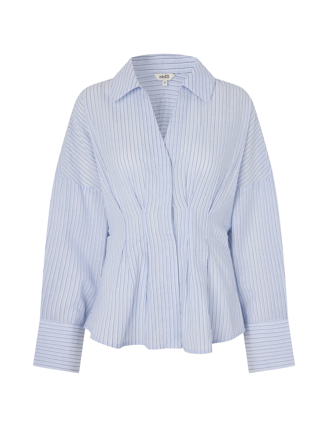 Ljusblå och vitrandig skjorta från MbyM. Skjortan har vertikala ränder och en strukturerad passform med synliga veck.