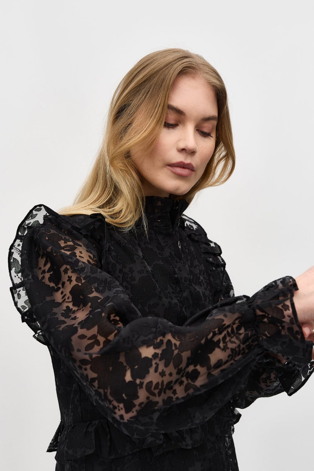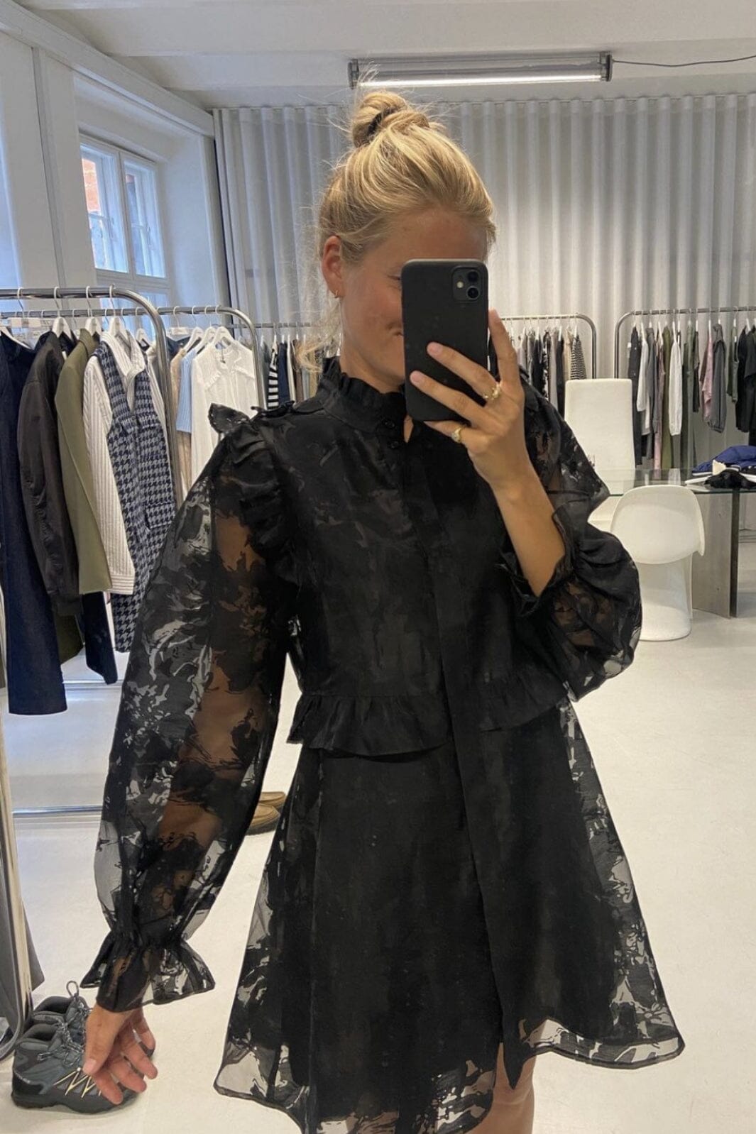 Svart festklänning från MbyM med genomskinligt spetsmaterial och blommönster. Klänningen har hög hals, långa ärmar och når till mitten av låret.