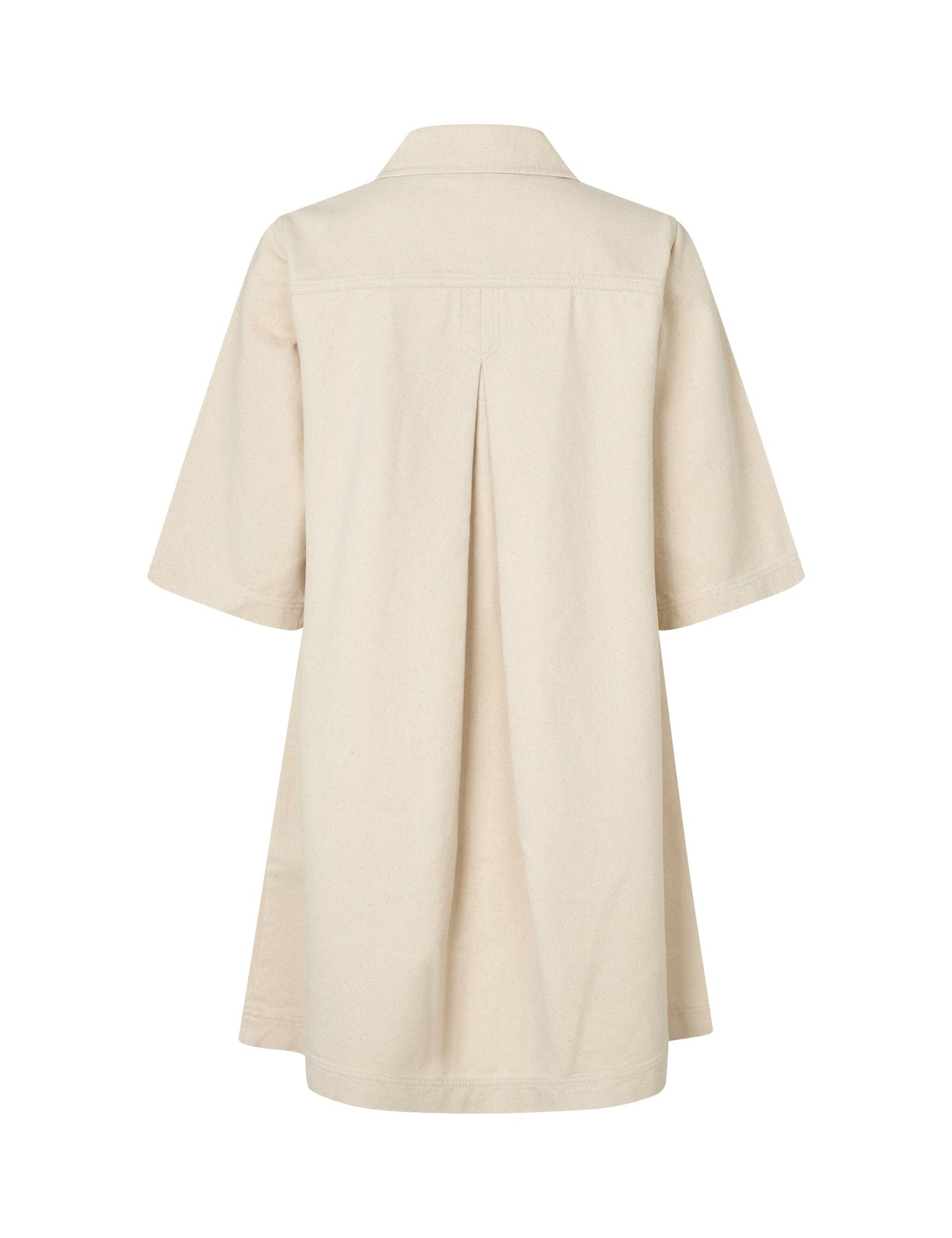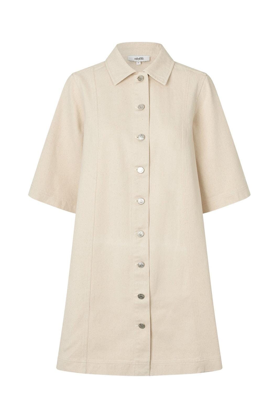 En beige skjortklänning från MbyM, tillverkad av 100 % bomull. Klänningen har skjortkrage, korta ärmar och knäppning hela vägen ner framtill.