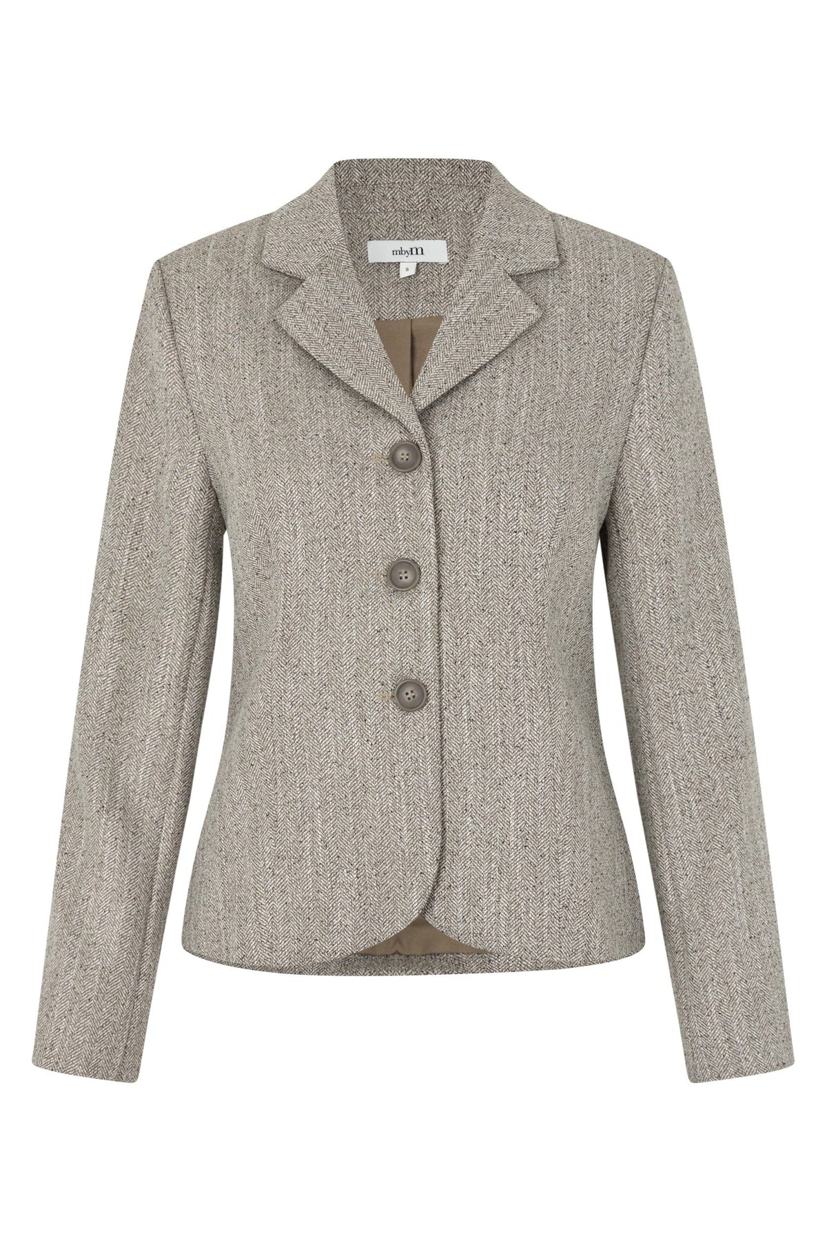 Grå blazer från MbyM med fiskbensmönster och melerad yta. Den har V-ringning, långa ärmar och knappstängning fram.