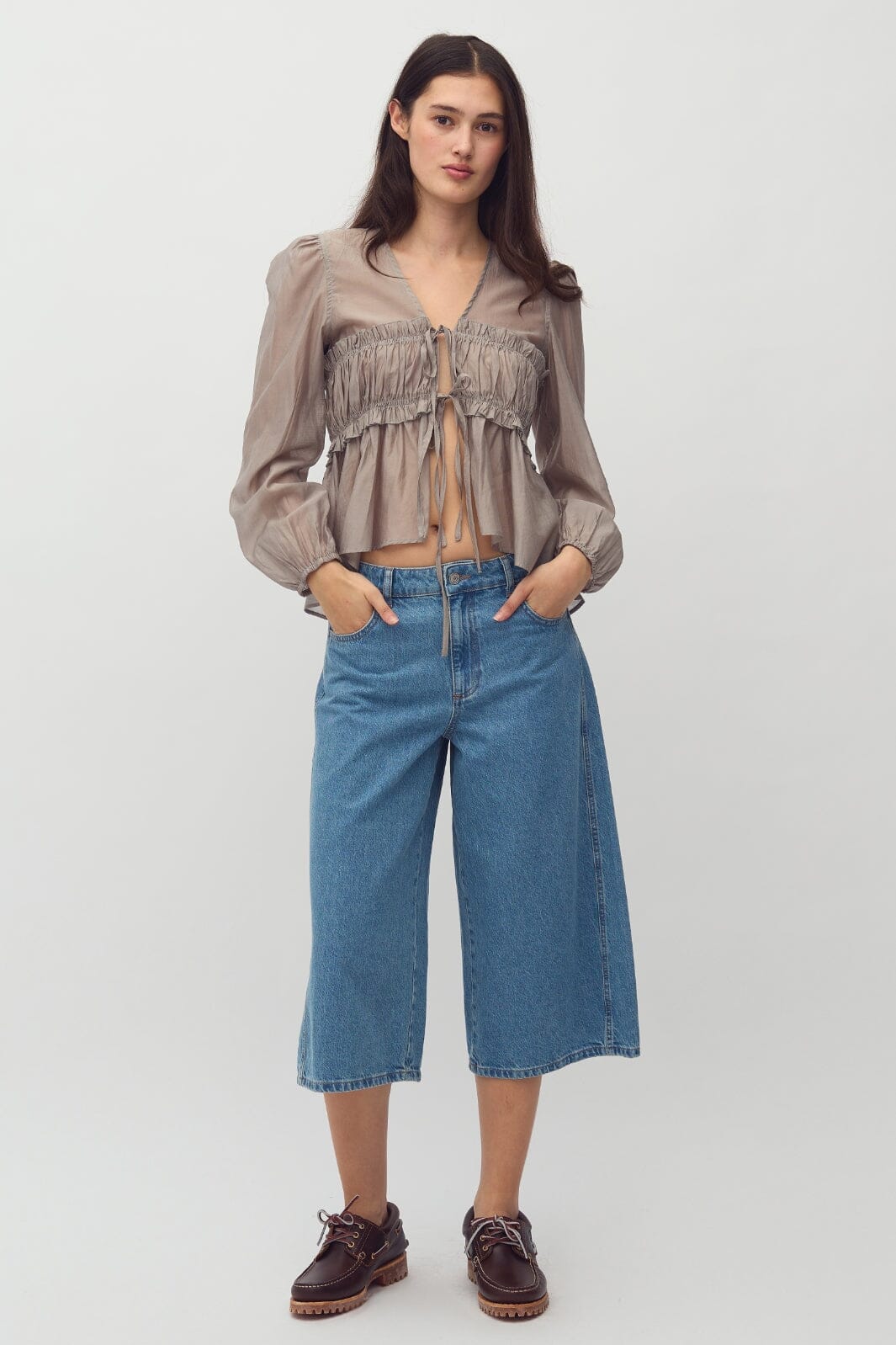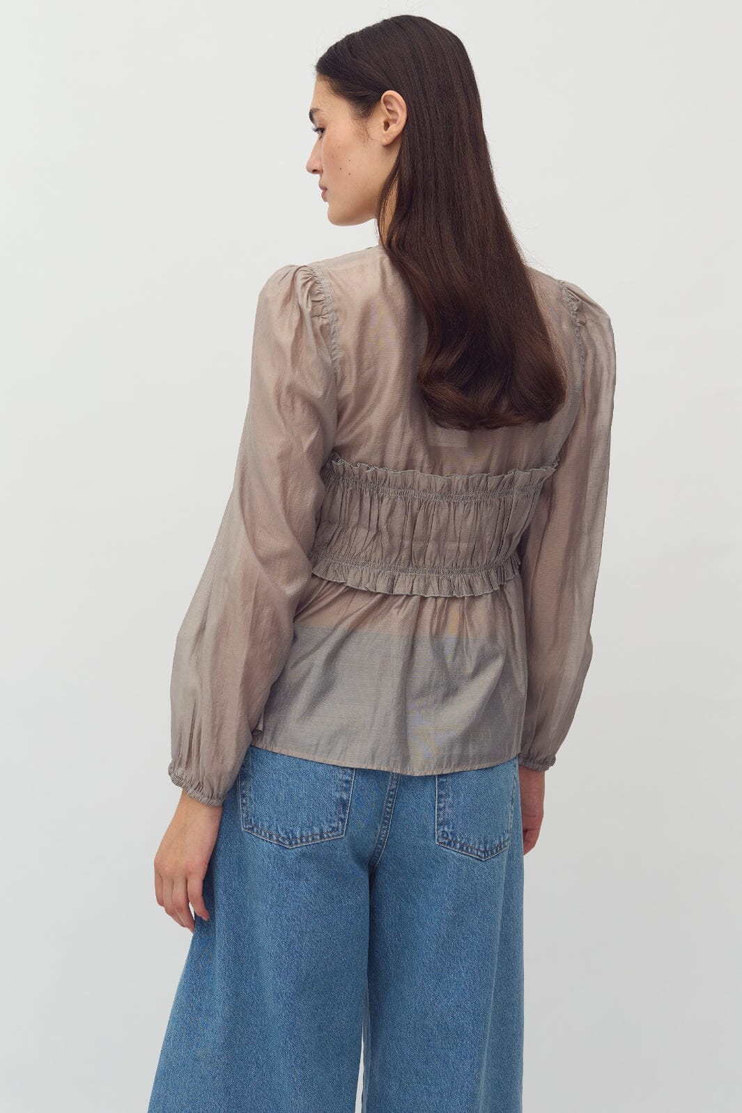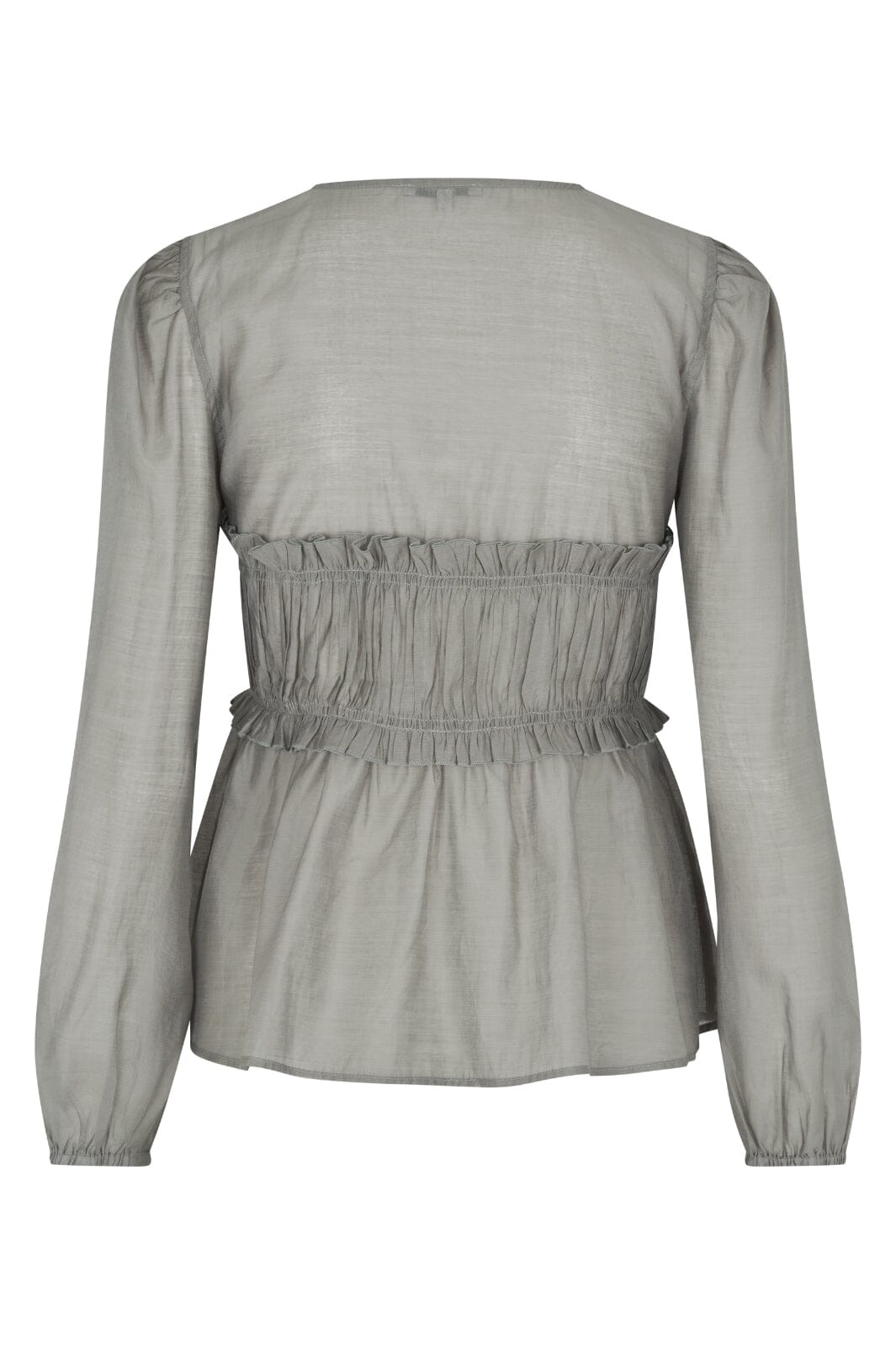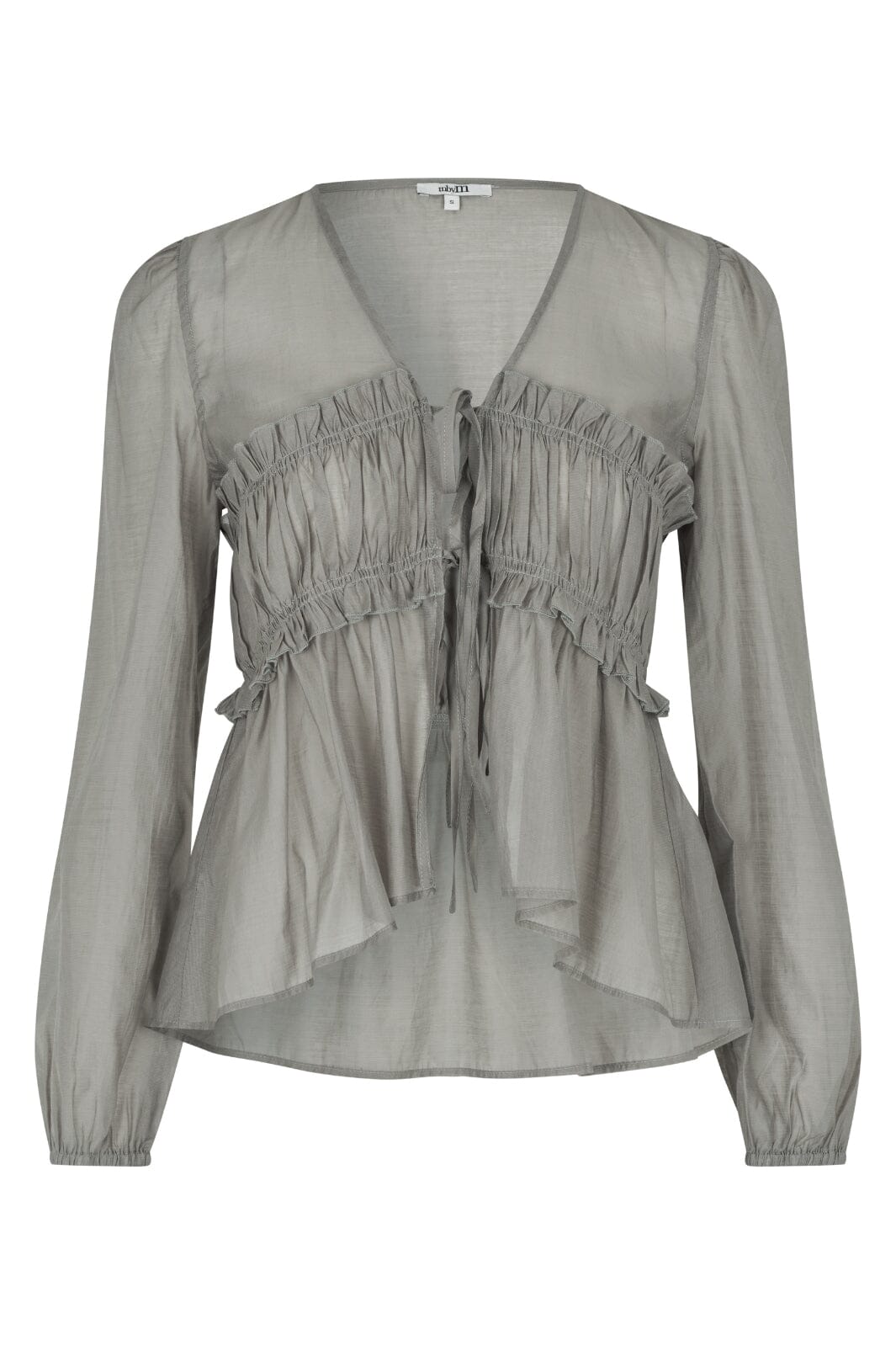 Grå blus från MbyM med samling vid bröstet och ryggen. V-ringning med snörstängning och volangdetaljer ger blusen karaktär. De långa ärmarna och de mjuka materialen skapar en bekväm passform.