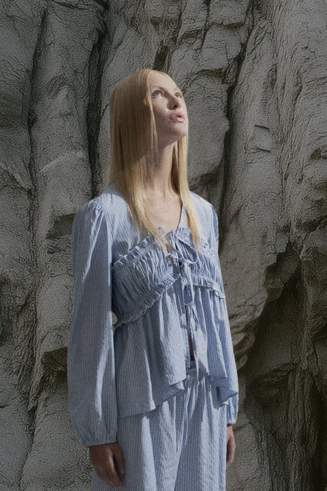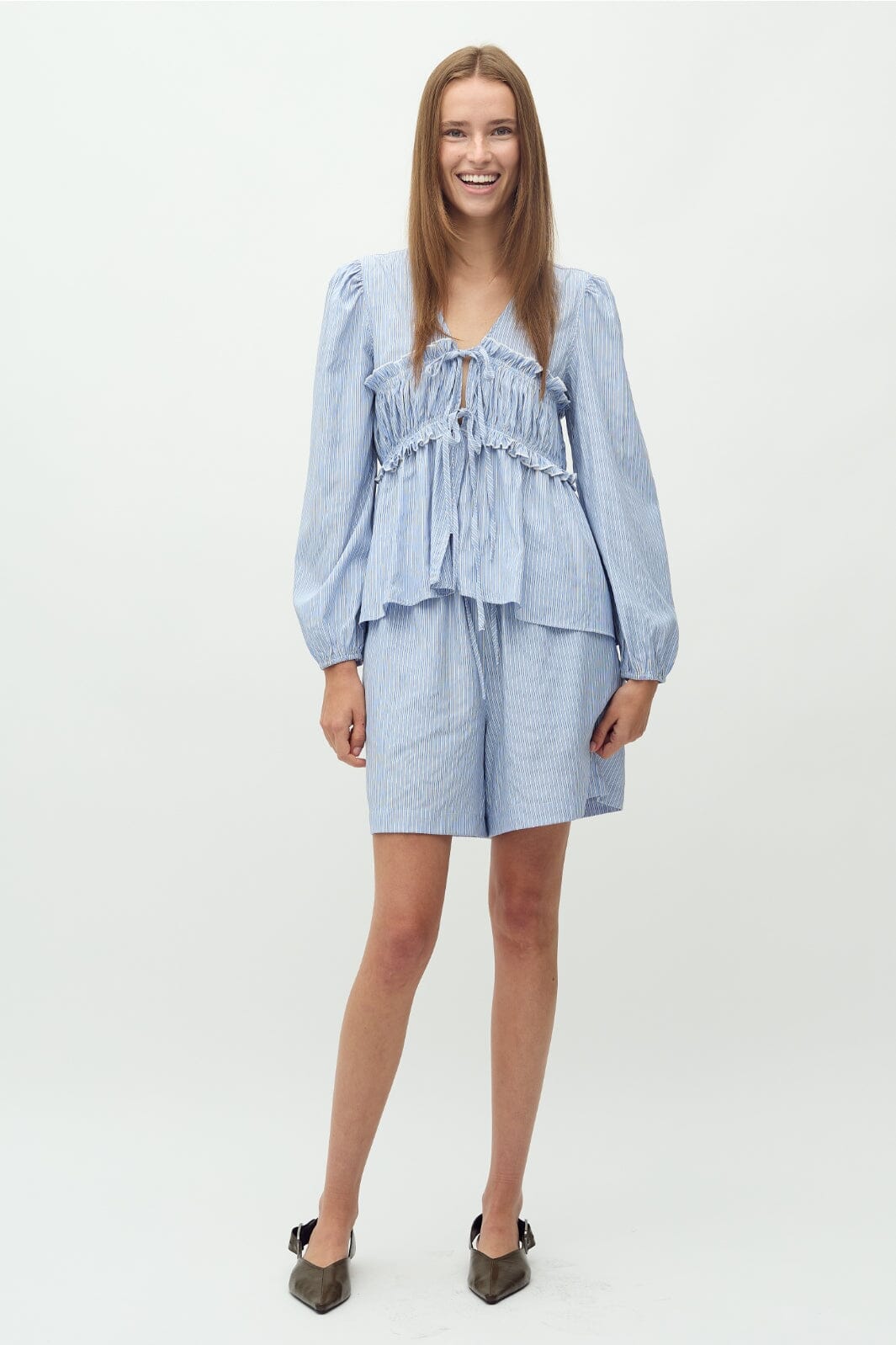Randig blus från MbyM i blått och vitt. Blusen har rynkade detaljer vid bröstet och ärmarna samt en V-formad halsringning som ger en feminin touch.