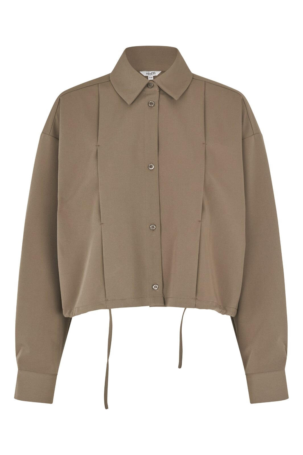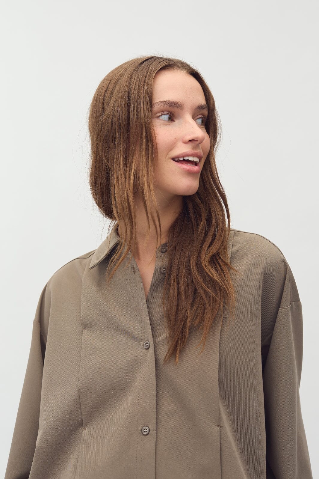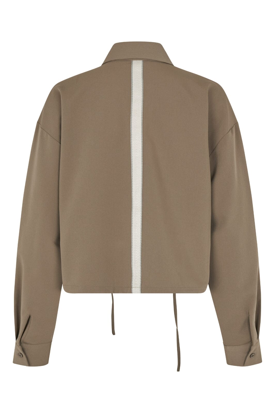 Skjorta från MbyM i färgen brindle sand med skjortkrage och långa ärmar. Den har knapplåsning fram och ett vertikalt rand på ryggen som skapar kontrast till grundfärgen.