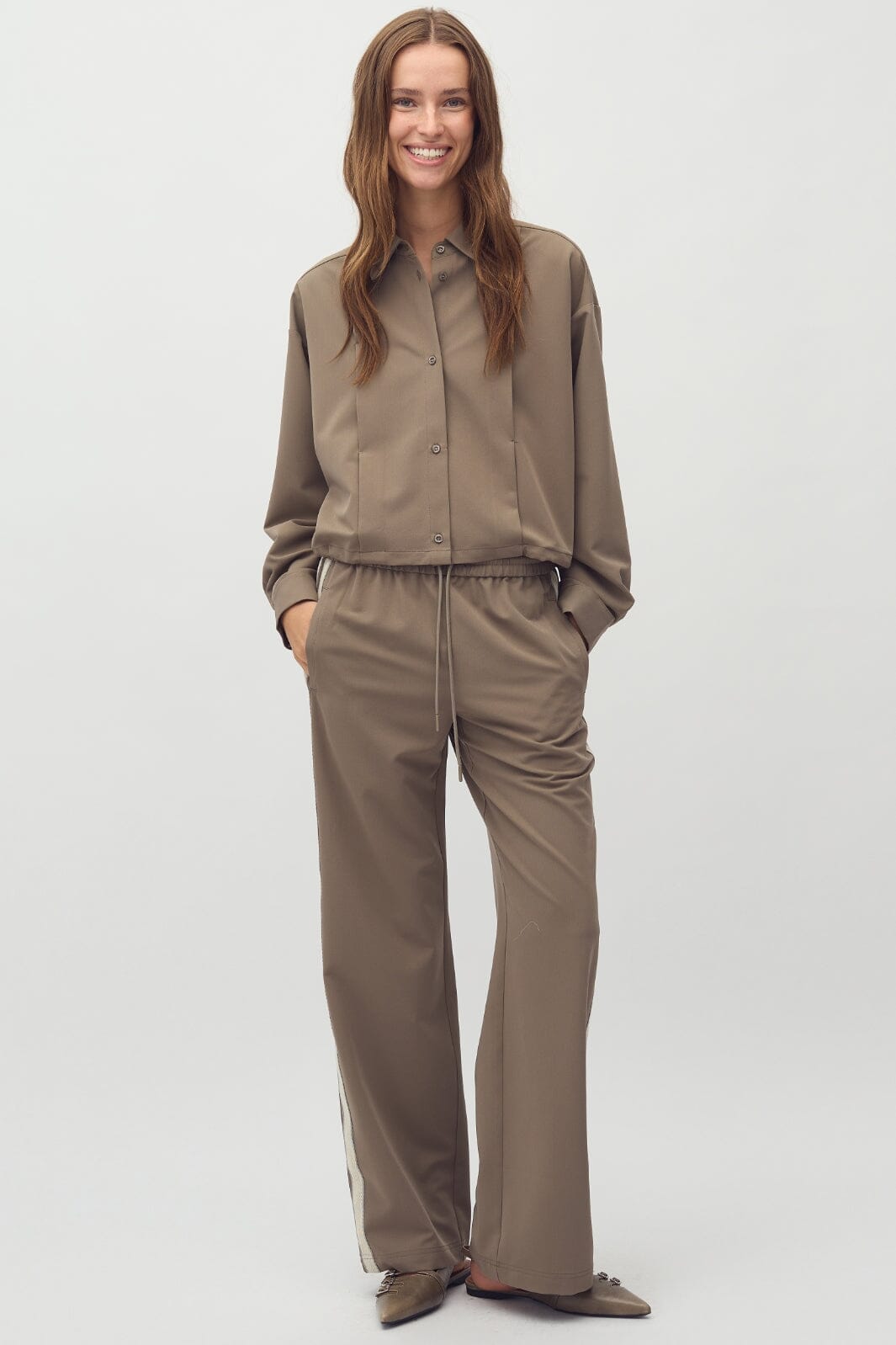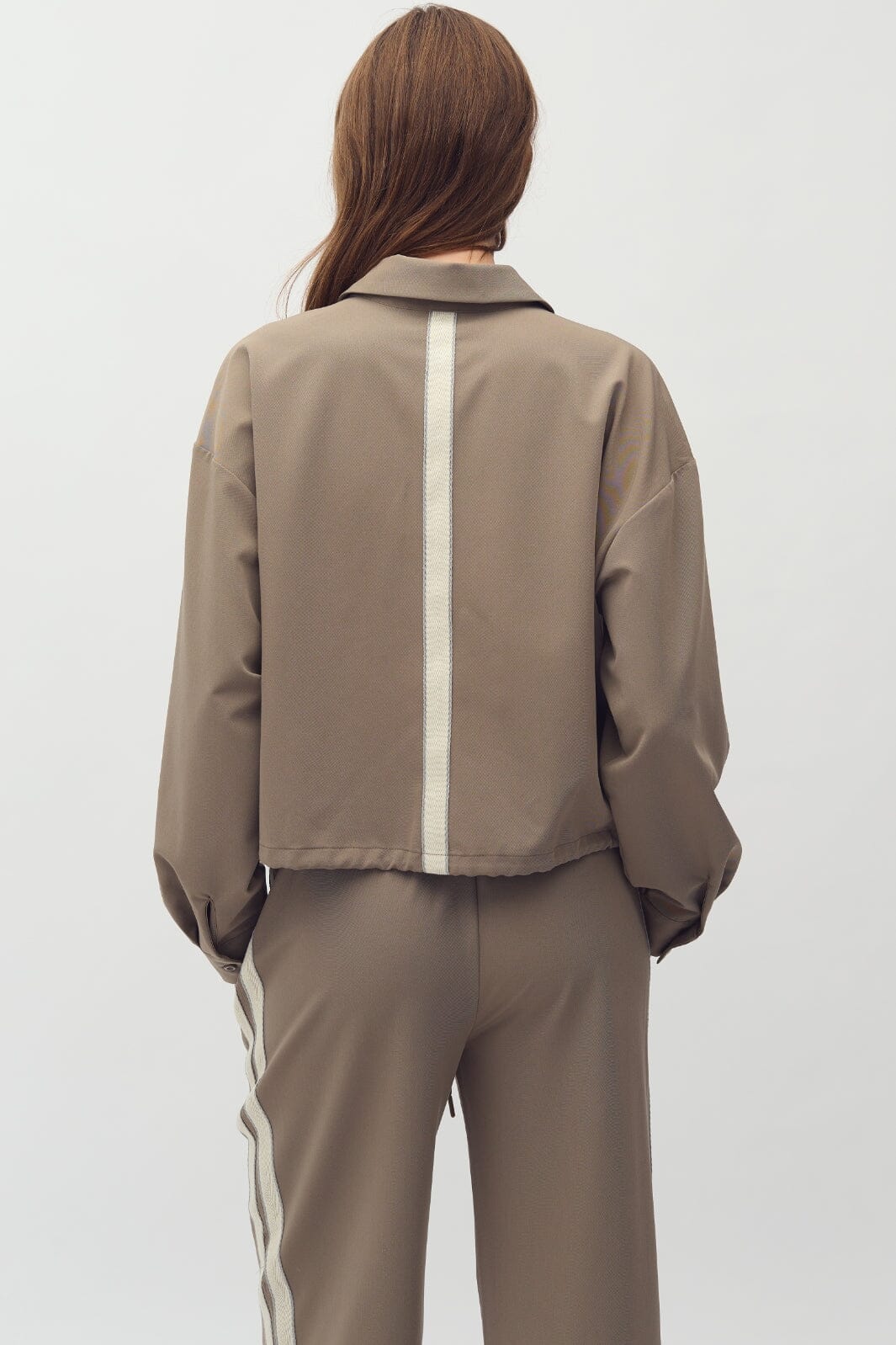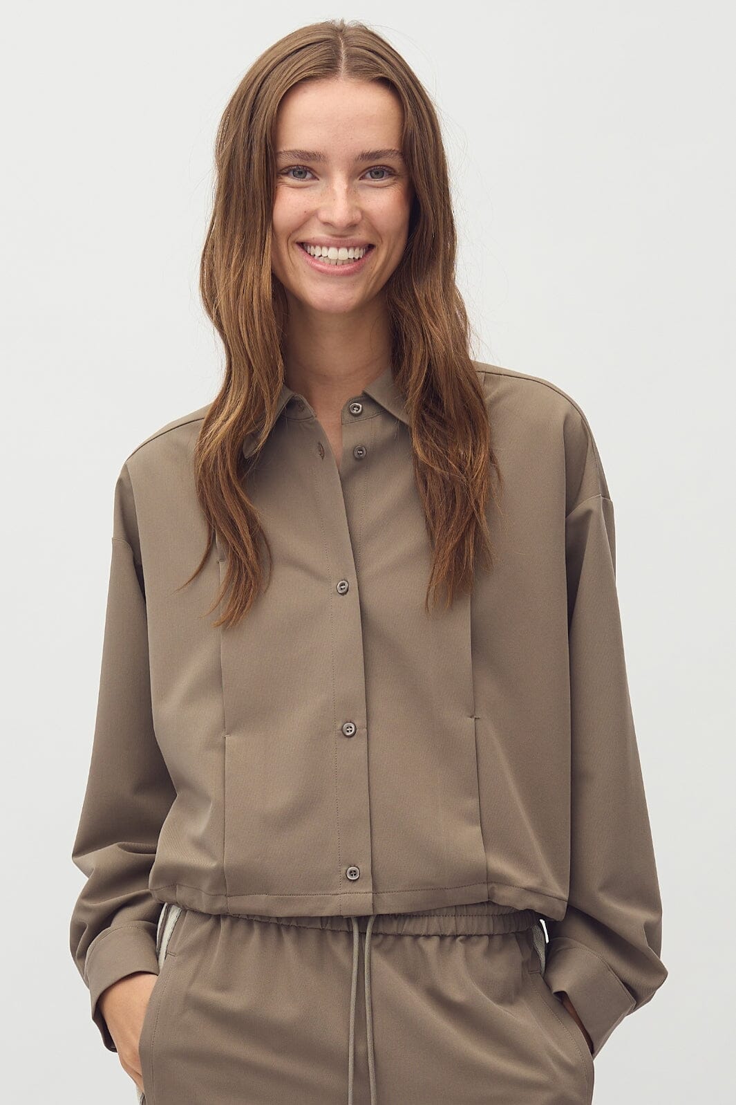 Skjorta från MbyM i färgen brindle sand med skjortkrage och långa ärmar. Den har knapplåsning fram och ett vertikalt rand på ryggen som skapar kontrast till grundfärgen.