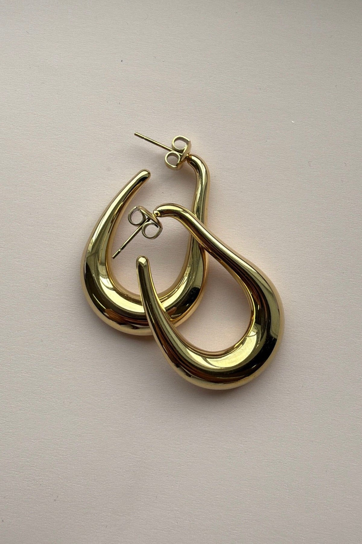 :Gyllene örhängen från Mellow Moon med en böjd form och slät yta. Örhängena har en polerad finish som ger ett glänsande uttryck.