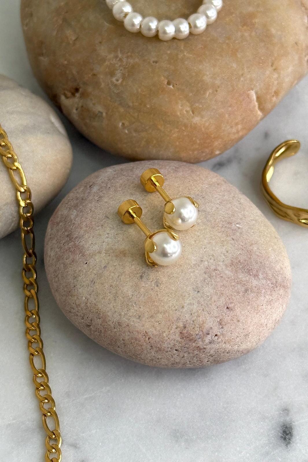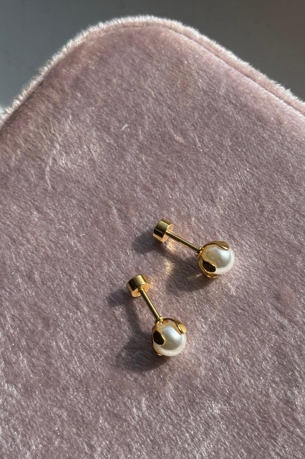 Guldpläterade örhängen från Mellow Moon med runda pärlor i änden. Örhängena har en glänsande yta och en enkel design med pärlan monterad på en gyllene stav.