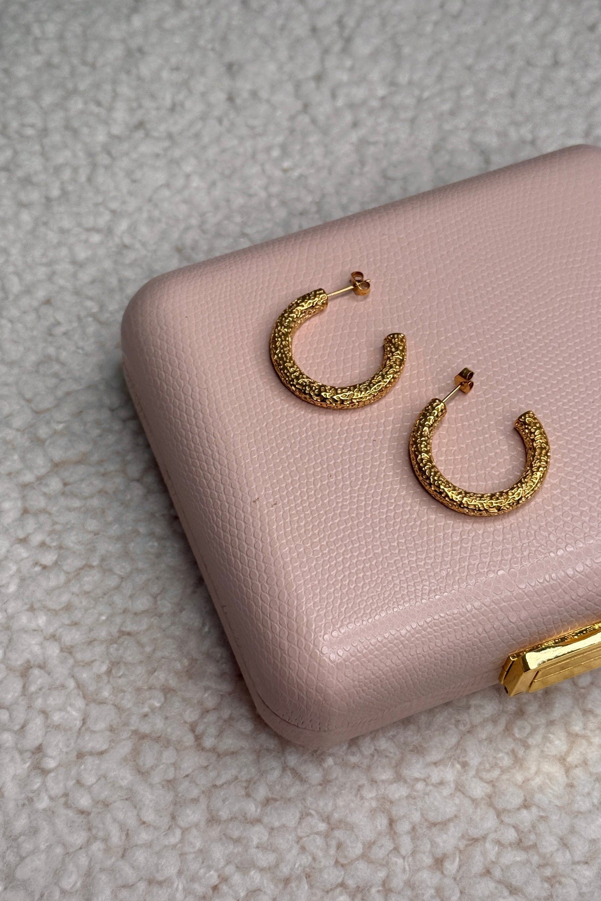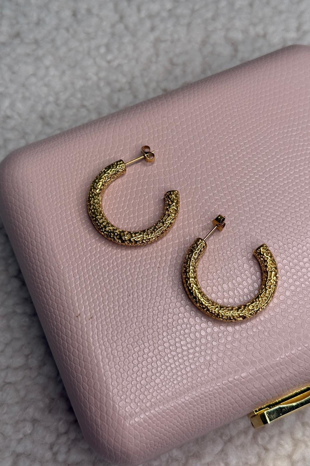 Guldpläterade hoops från Mellow Moon med en prickig yta. Örhängena har en klassisk hoop-design i medelstorlek som passar till många olika tillfällen.