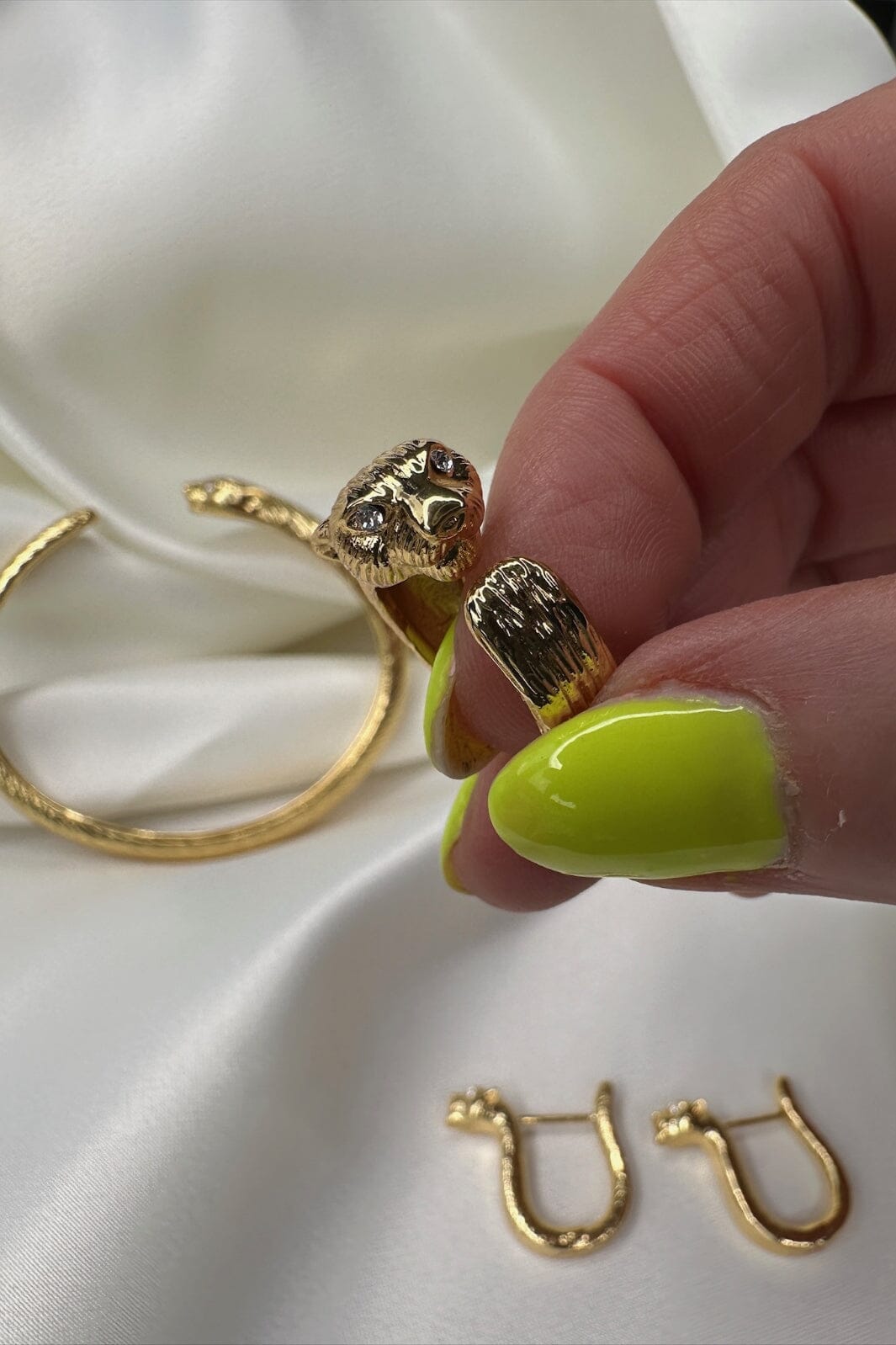 Förgylld ring från Mellow Moon med ett detaljerat leopardhuvud. Ringen har en liten ädelsten som öga och är utförd i rostfritt stål med gyllene finish.