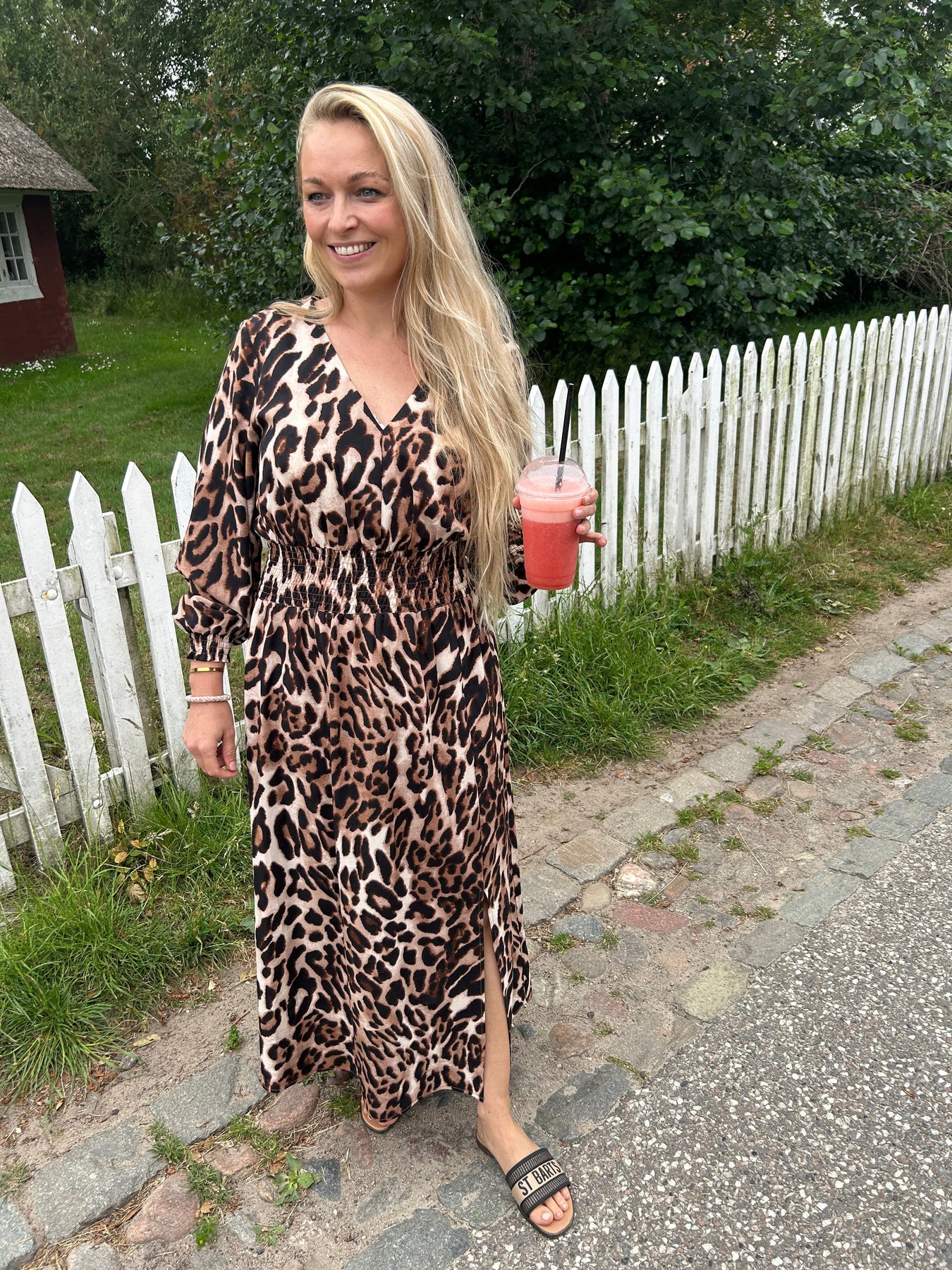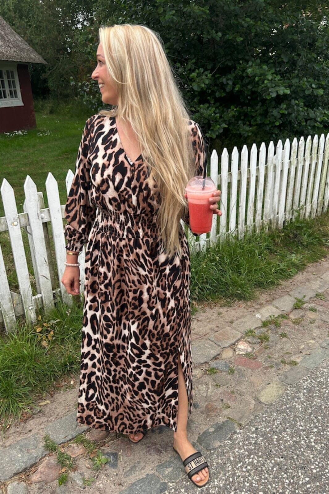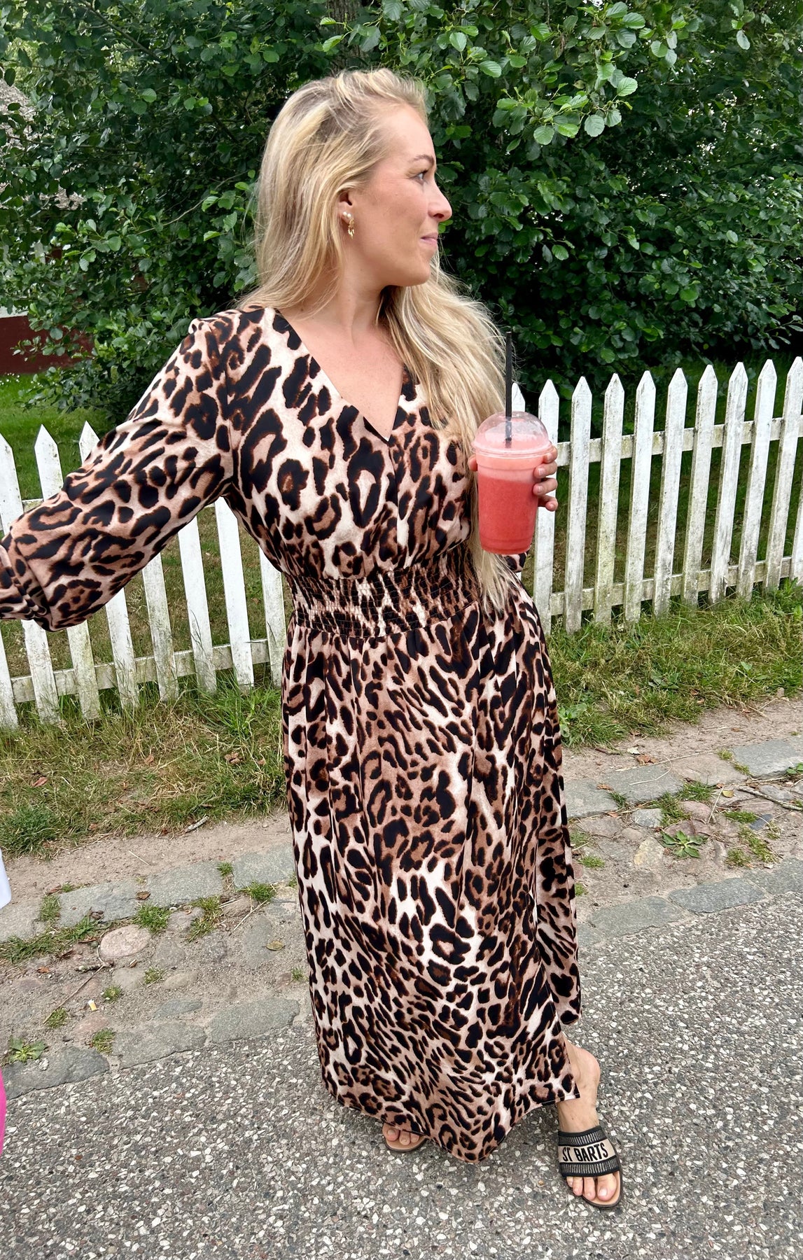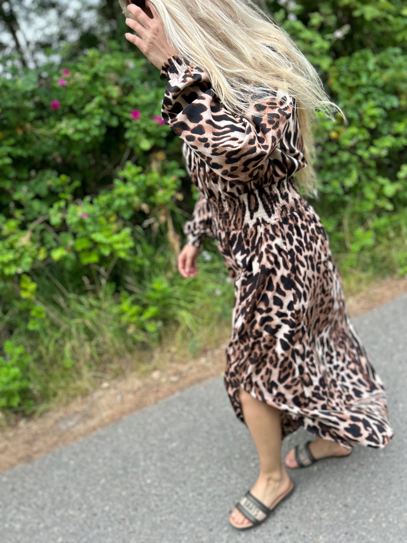 Vacker leopardklänning från Mellow Moon. Klänningen har smock vid ärmsluten samt ett brett smockstycke vid midjan. Klänningen är i en härlig lätt kvalitet och har en v-ringning.