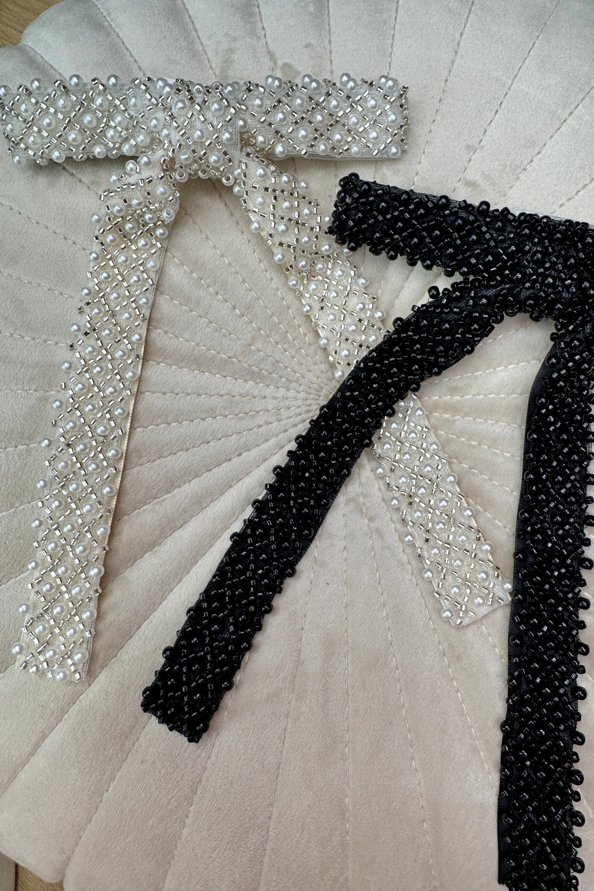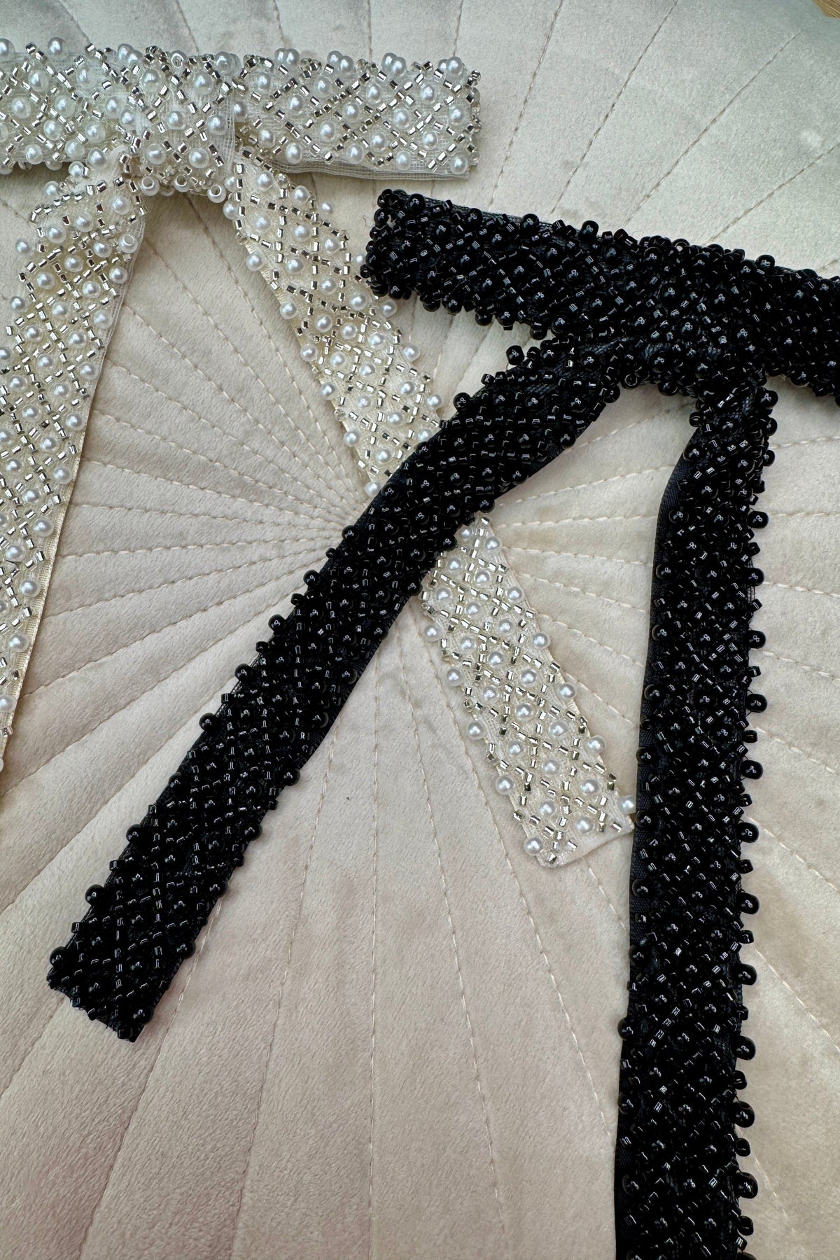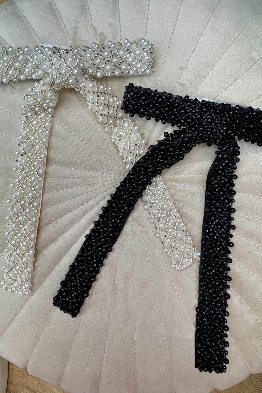 Vit rosett från Mellow Moon med pärlprydnad och korsmönster. Rosetten har en detaljerad design med små pärlor som bildar ett genomgående mönster på hela ytan.