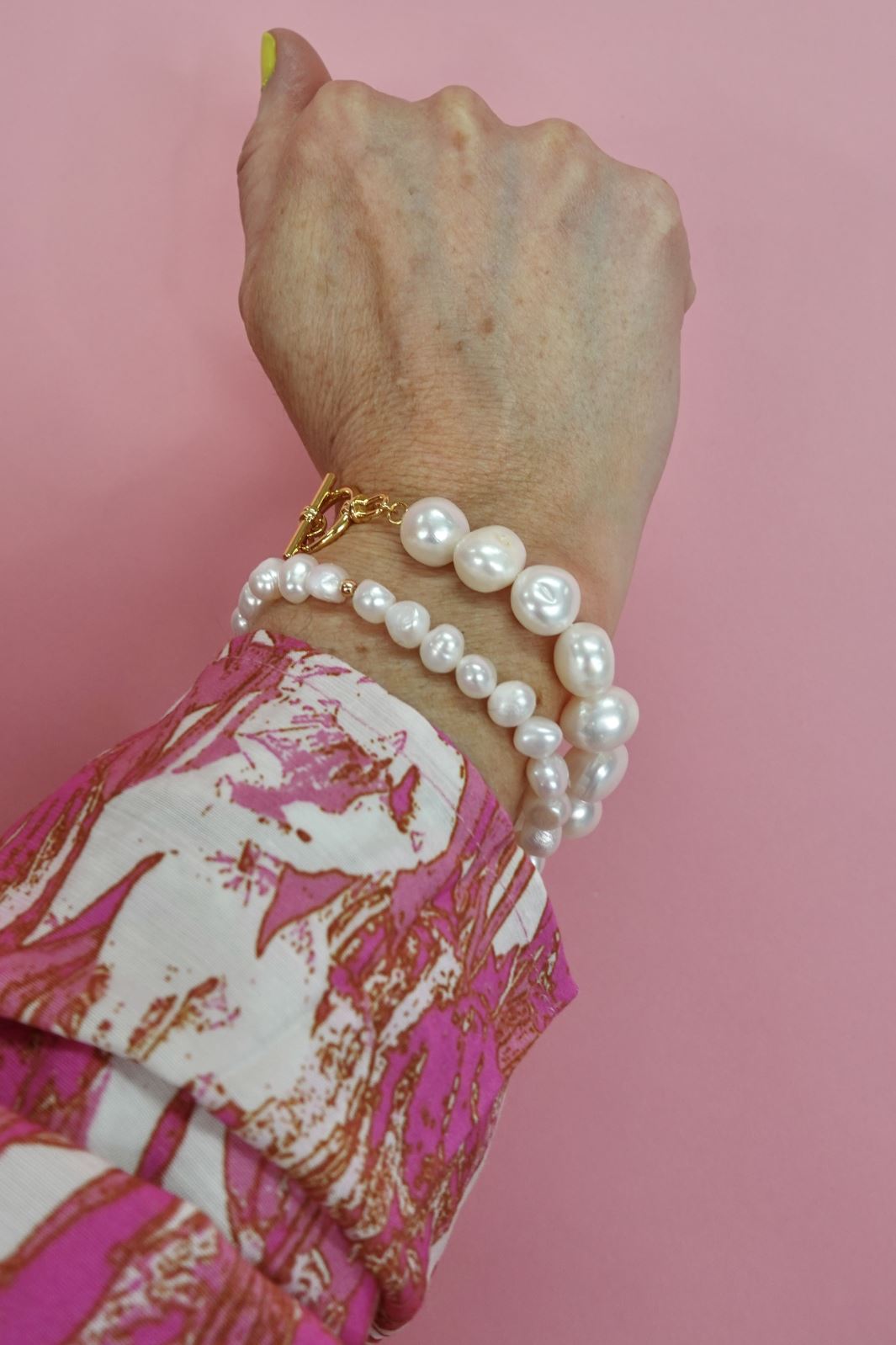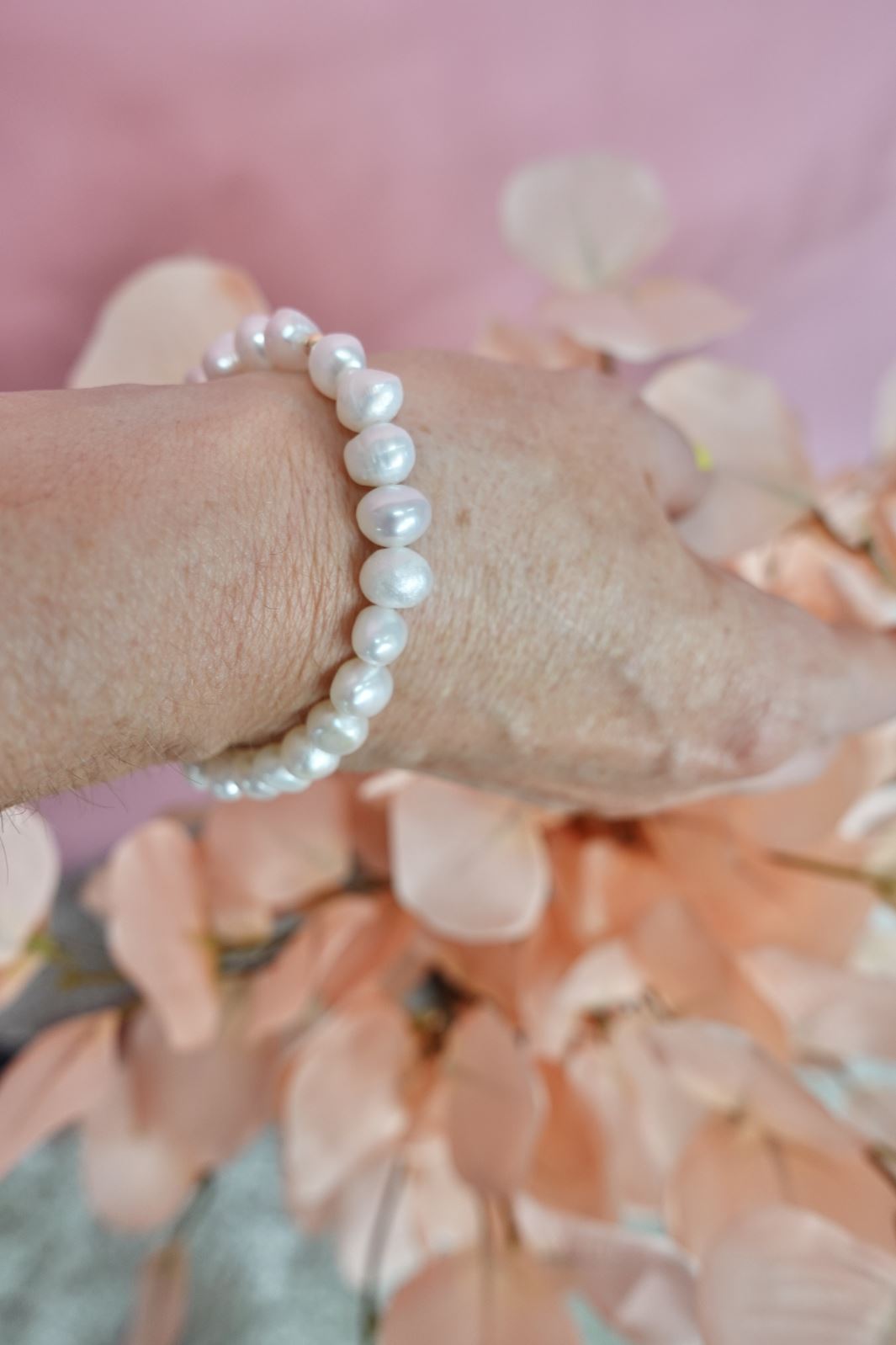 Pärlarmband med vita sötvattenspärlor och förgyllt detalj. Pärlorna är monterade på ett elastiskt snöre med en förgyld pärla som kontrast till de vita pärlorna.