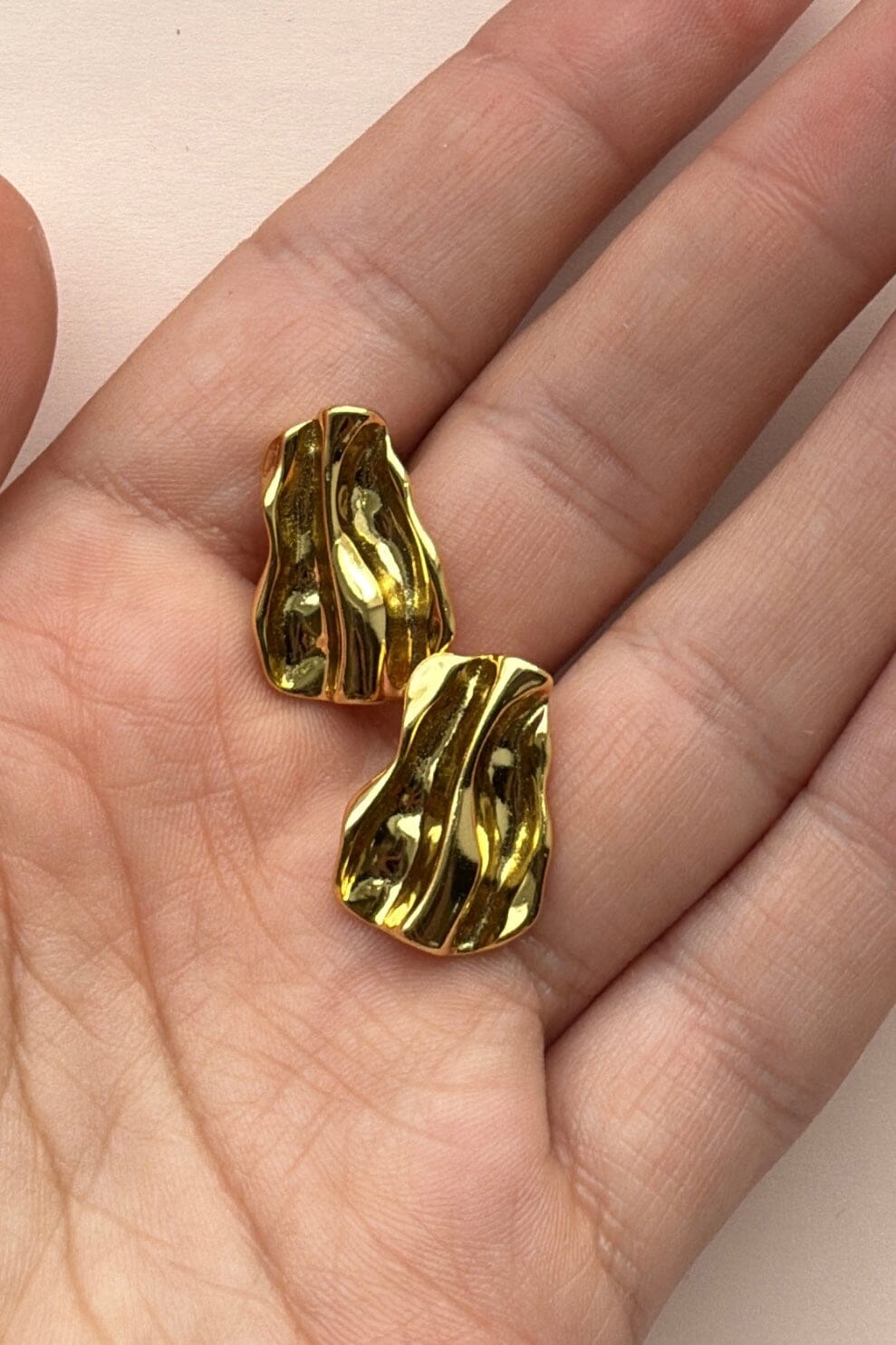 Guldpläterade örhängen från Mellow Moon med en vågig yta. Örhängena är tillverkade av sterlingsilver med en 18 karat guldplätering som ger en gyllene ton till den texturerade designen.