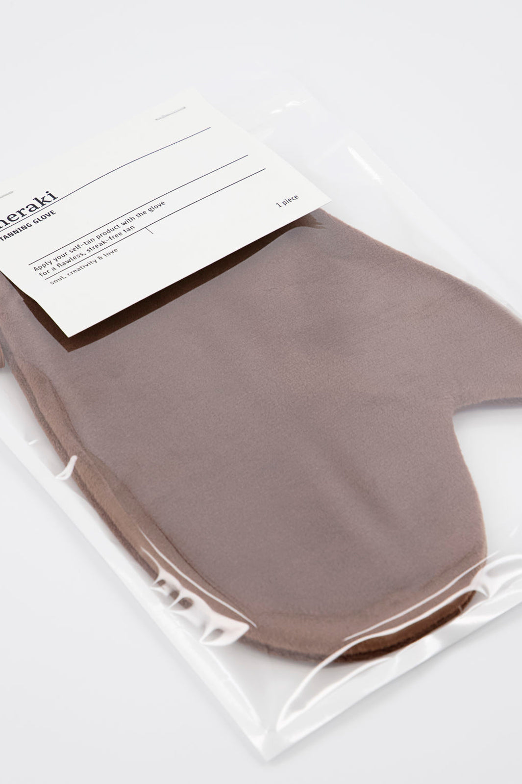 Brun självbruningshandske för applicering av självbrunare. Handsken säkerställer en jämn fördelning av produkten och minskar risken för ränder och ojämnheter.