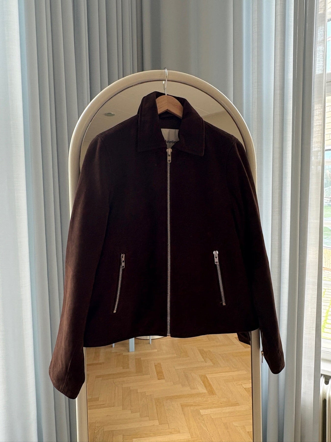 Brun mockajacka från Modström med skjortkrage. Jackan har en varm brun färg och är tillverkad i mjukt getmocka med dragkedjestängning fram.