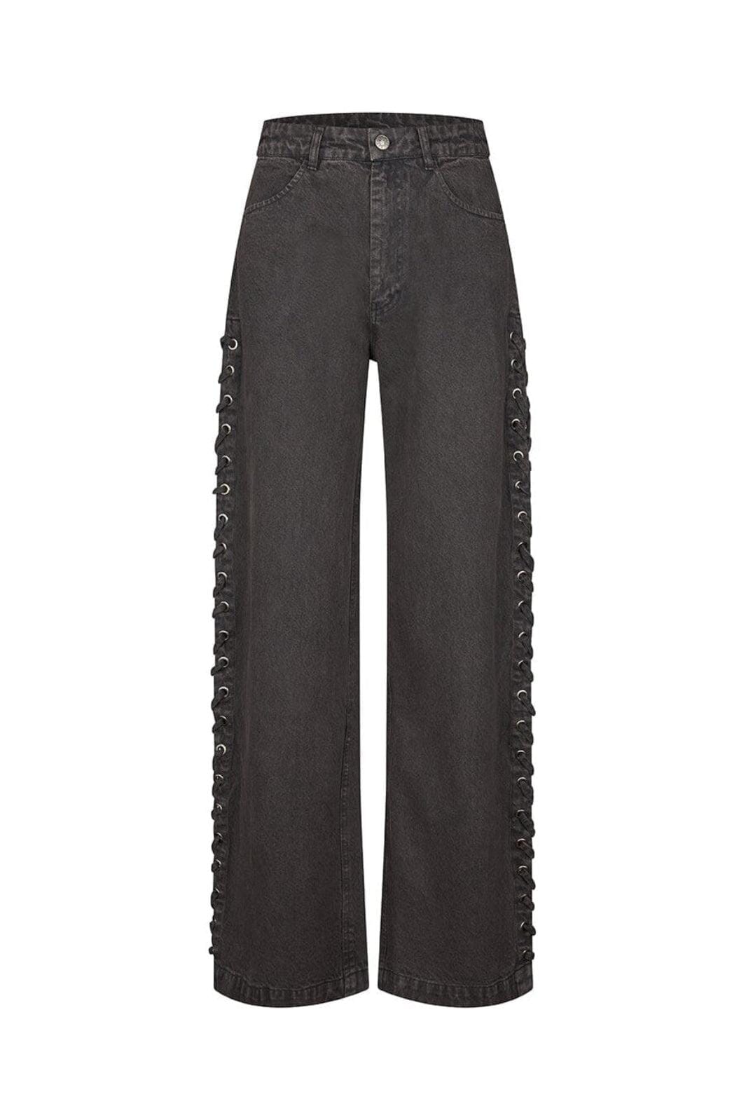 Vintage grå byxor från Modström med hög midja och lång längd. Byxorna har snördetaljer längs benen samt både fram- och bakfickor. Knappar och dragkedja i stängningen.