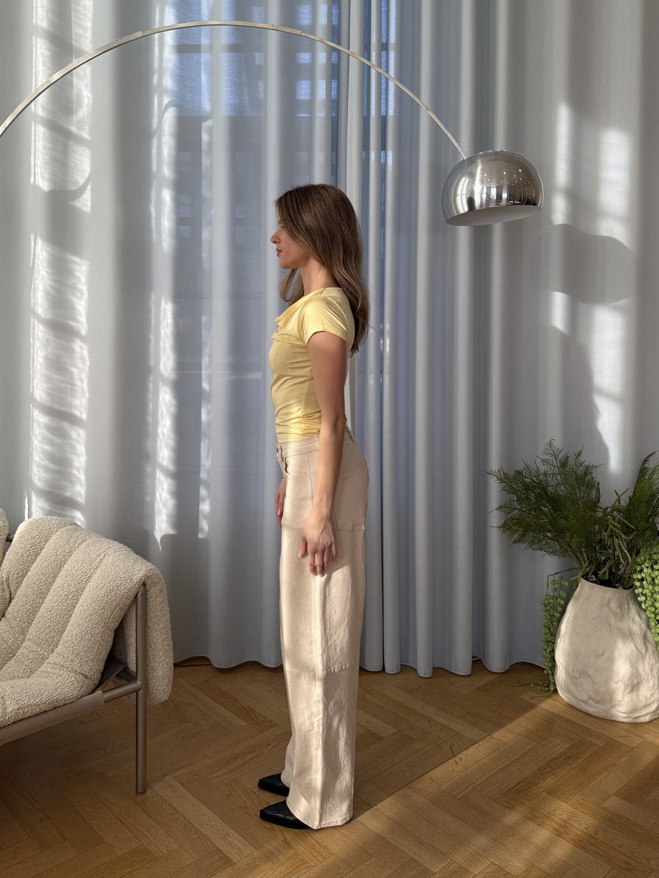Ljus sandfärgade jeans från Modström med hög midja och lös passform. Jeansen är gjorda av bomull med elastan och går till ankeln.