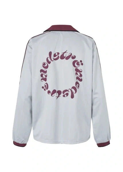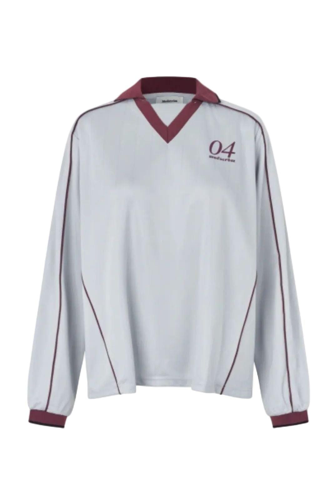 Ljusgrå långärmad T-shirt från Modström i 100 % polyester. T-shirten har polokrage med V-ringning och mörkröda detaljer på kragen, muddarna och längs ärmarna.