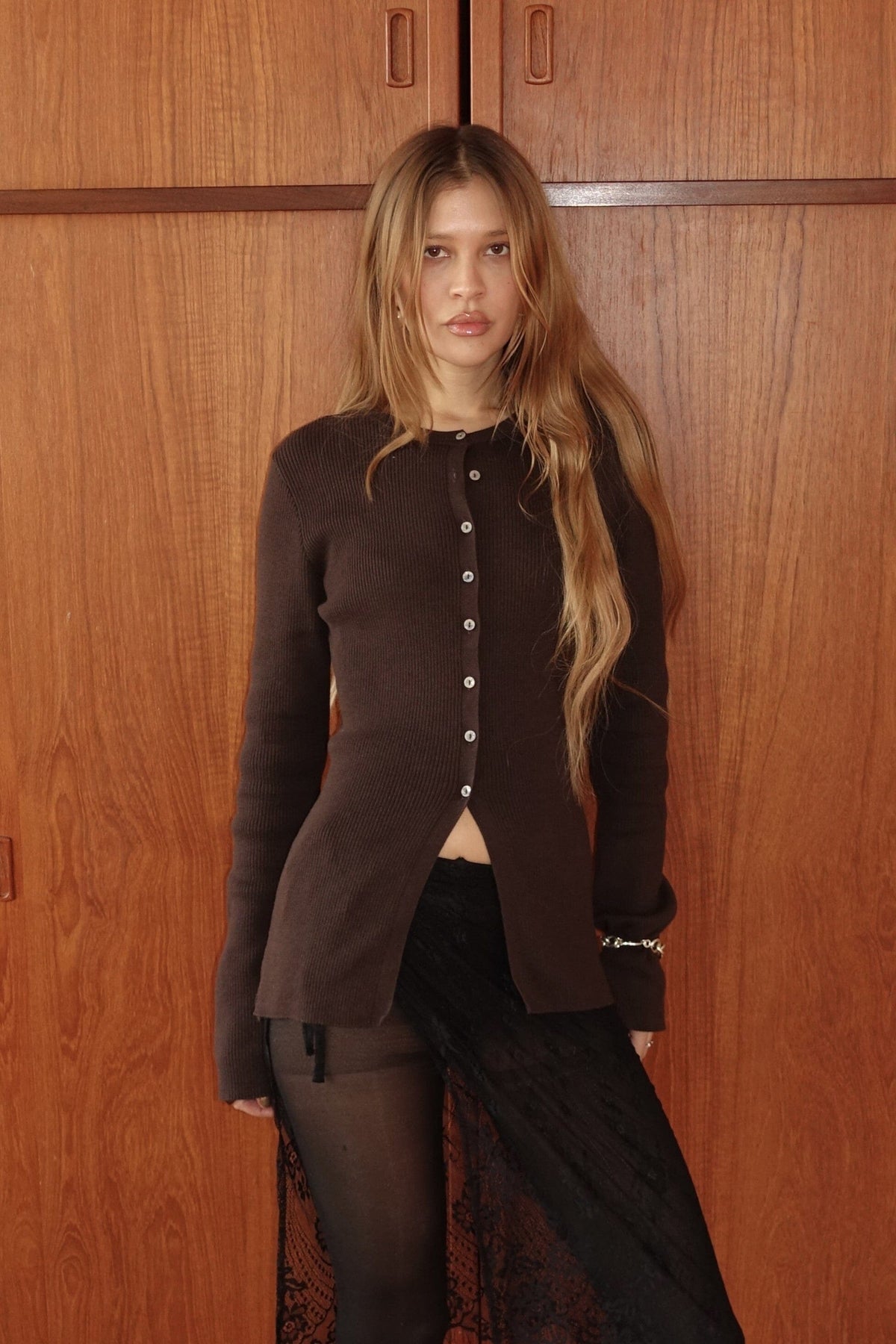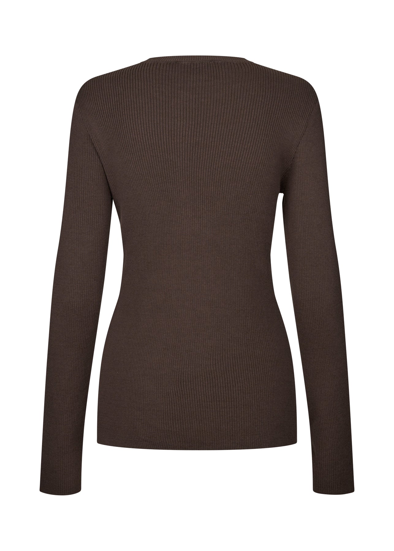 Brun kofta från Modström med ribbstickad textur och en figurnära passform. Koftan har långa ärmar och knäppning framtill.