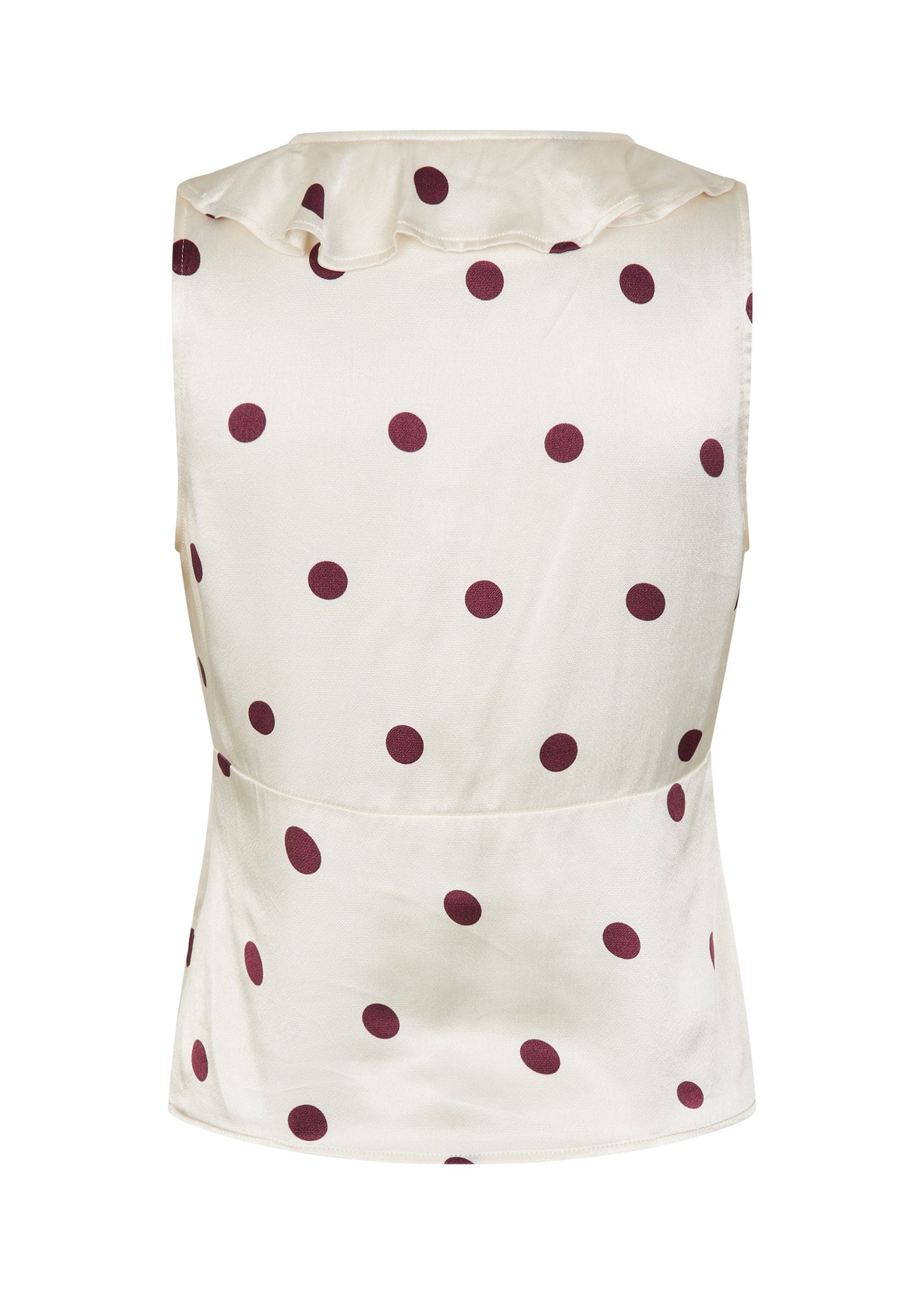 Ärmlös topp från Modström med polkaprickigt mönster i vinbärsfärg på en cremefärgad botten. Toppen har en V-ringning med volangdetaljer och knytband framtill.