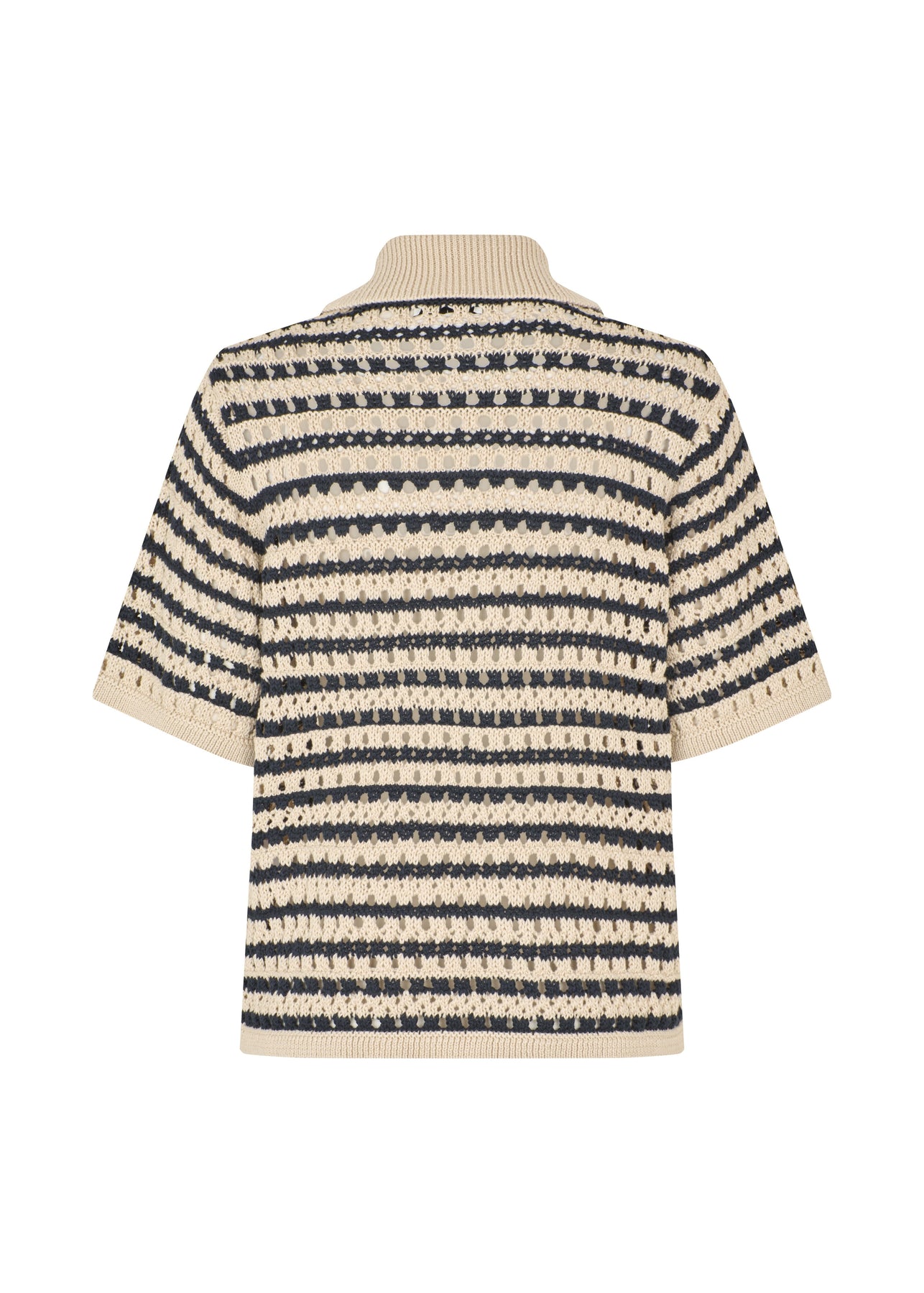 En stickad kofta från Modström med ränder i mörkblått och sandfärgat. Koftan har korta ärmar, krage och ett lätt genomskinligt hålmönster.