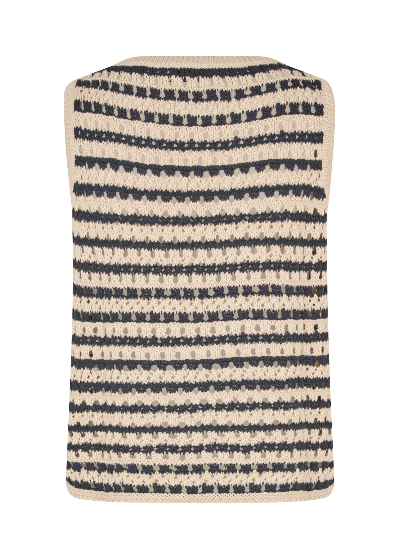 Randig stickad topp från Modström i mörkblått och sandfärgat. Den ärmlösa toppen har ett hålmönster och är tillverkad av 100 % ekologisk bomull.