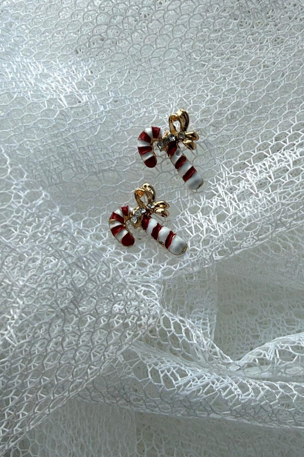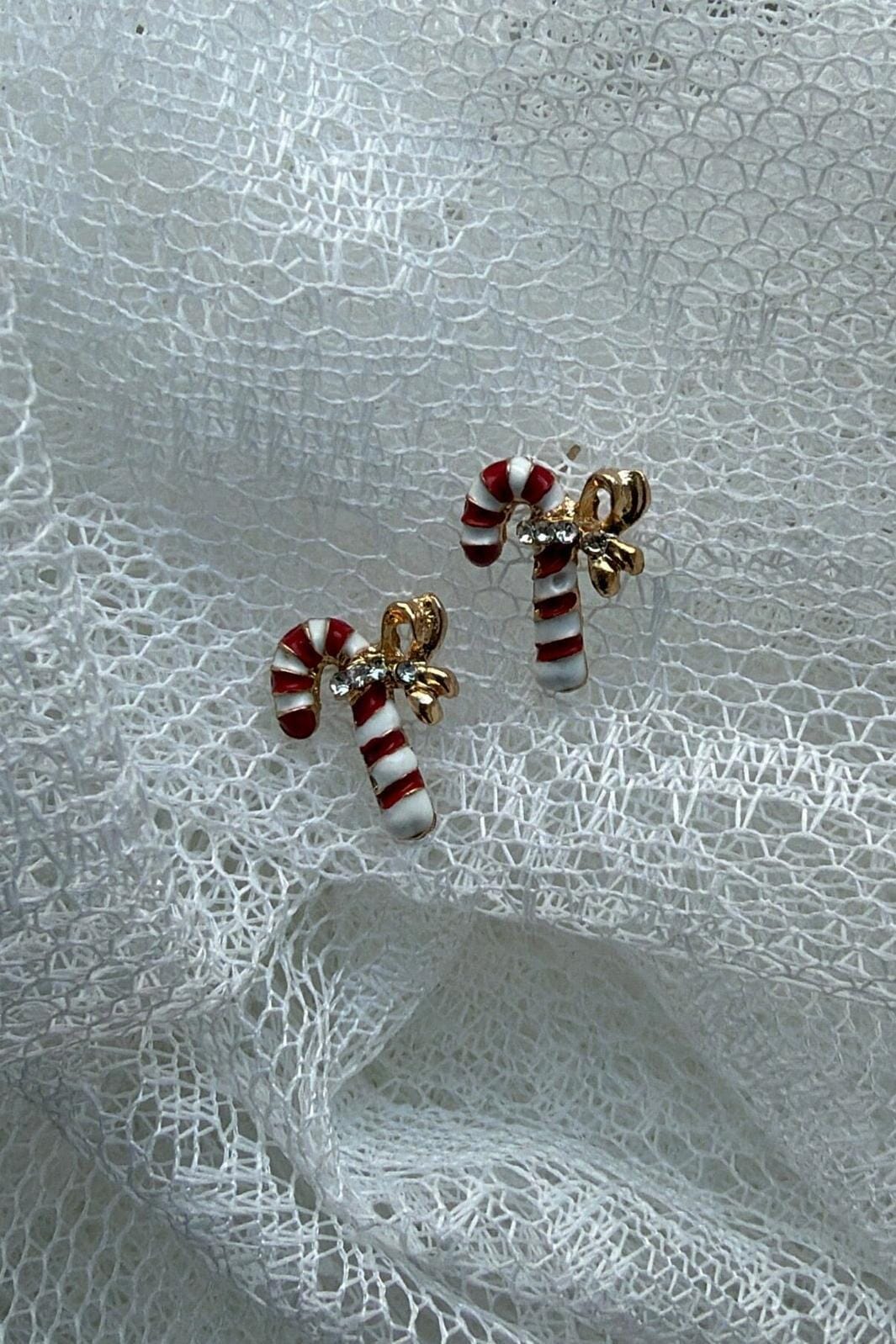 Örhängen från Molly&My Jewellery utformade som polkagriskäppar med röda och vita ränder. De har en liten guldfärgad rosett och en klar sten.