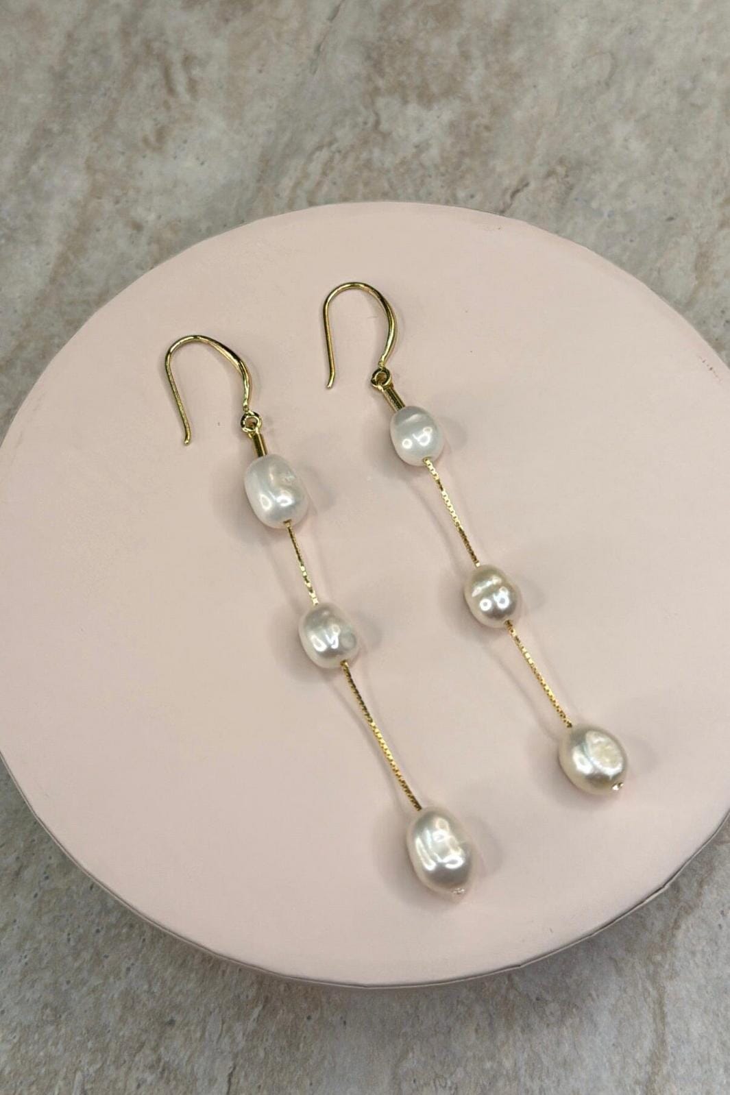 Örhängen från Molly&My Jewellery med tre vita, ovala sötvattenspärlor sammanlänkade med en tunn, guldfärgad kedja på varje örhänge.