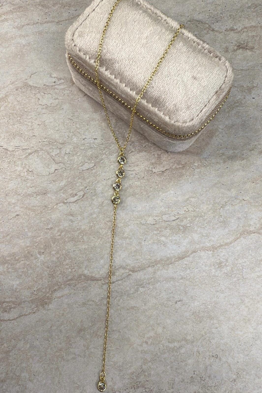 Förgylld halskedja från Molly&My Jewellery med Y-kedjedesign. Kedjan är gjord av mässing och har små cirkulära element med stenar.