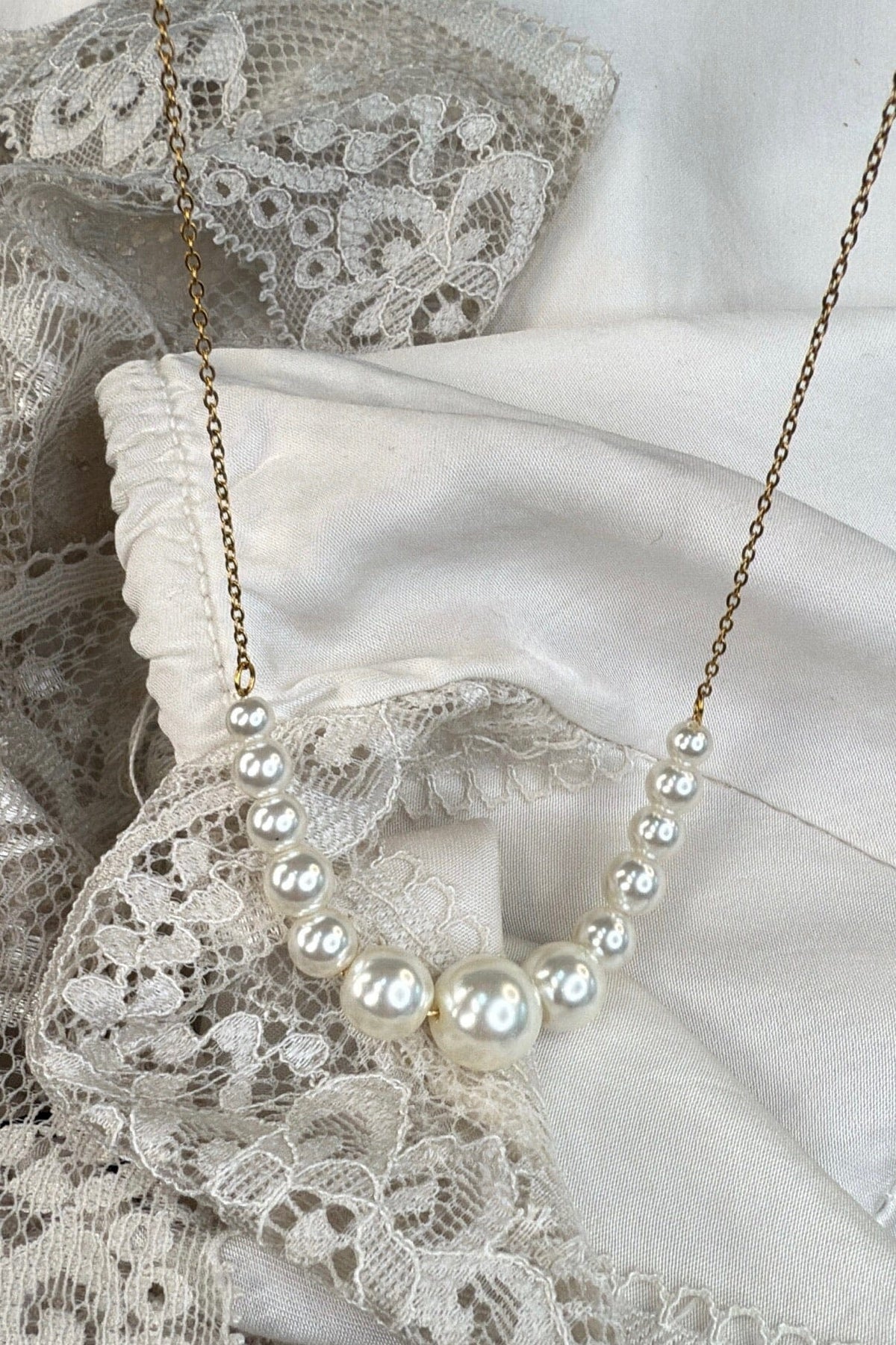 Halsband från Molly&My Jewellery med graderade imiterade pärlor på en tunn, gyllene kedja. Pärlorna varierar i storlek från små till stora.