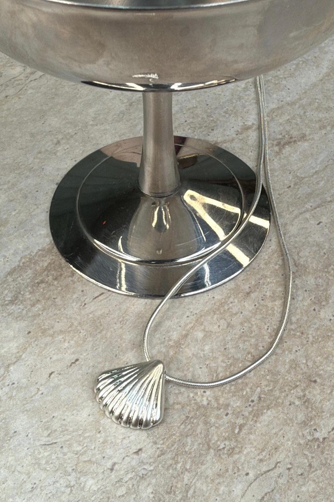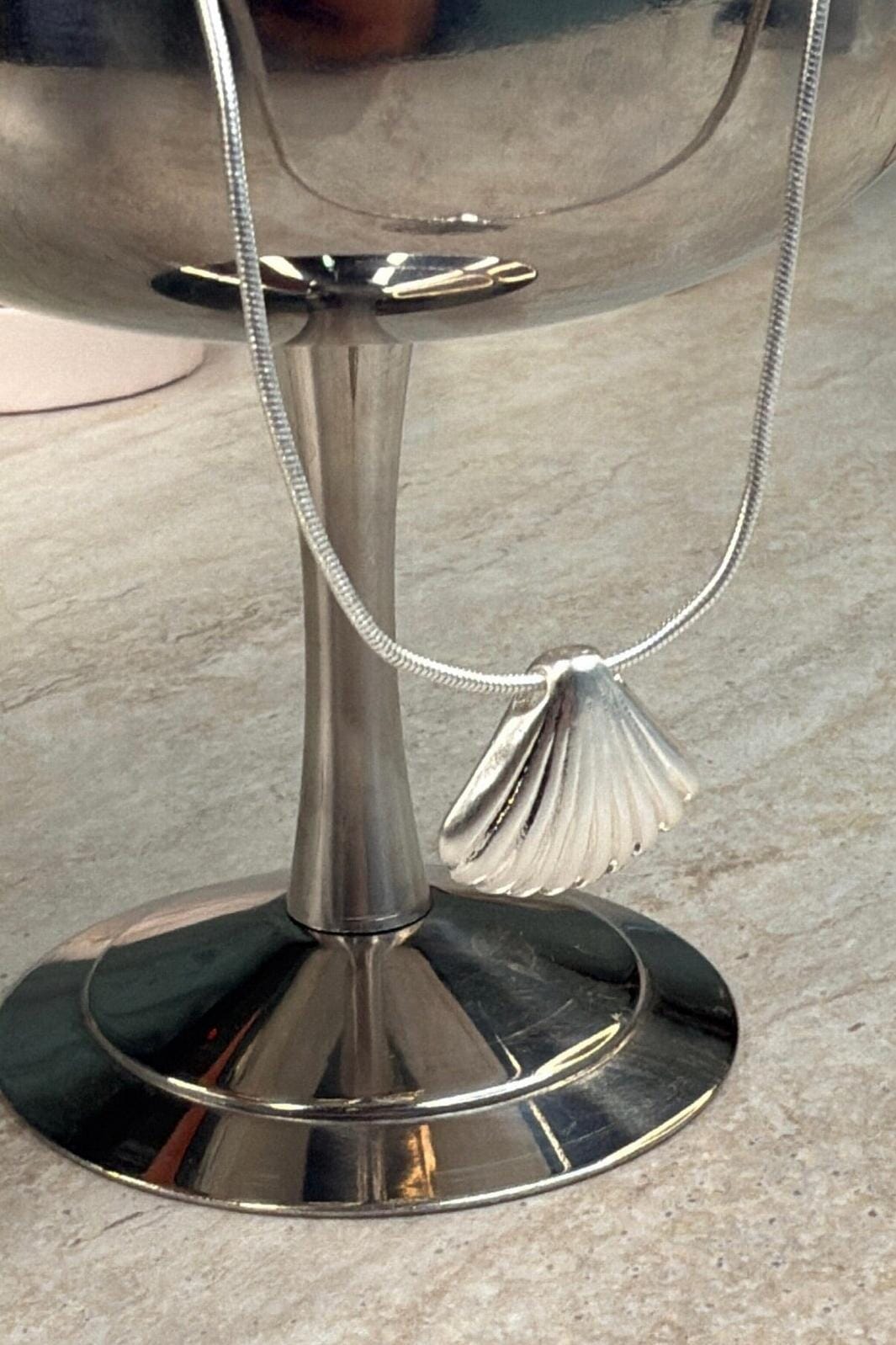 Försilvrad halskedja från Molly&My Jewellery med ett musselskalformat hänge. Halskedjan har en ormkedja och en räfflad struktur på hänget.