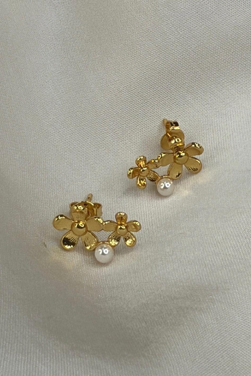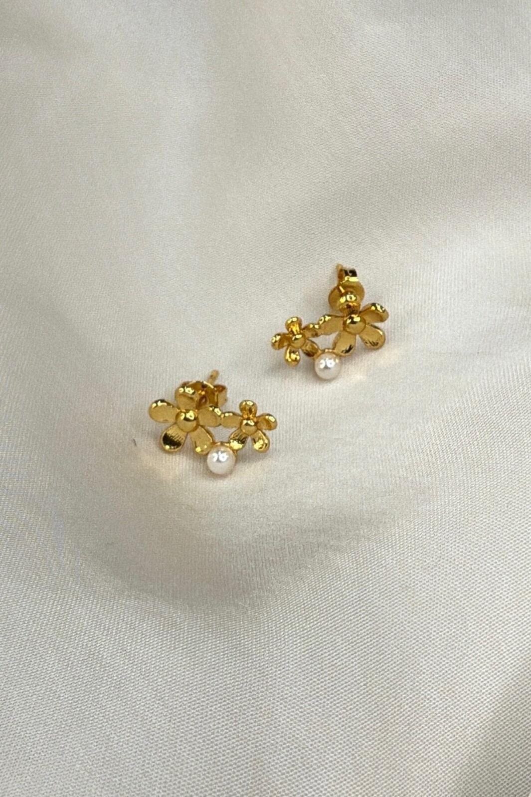 Förgyllda örhängen från Molly&My Jewellery med två små blommor i guld och en vit pärla på varje örhänge.