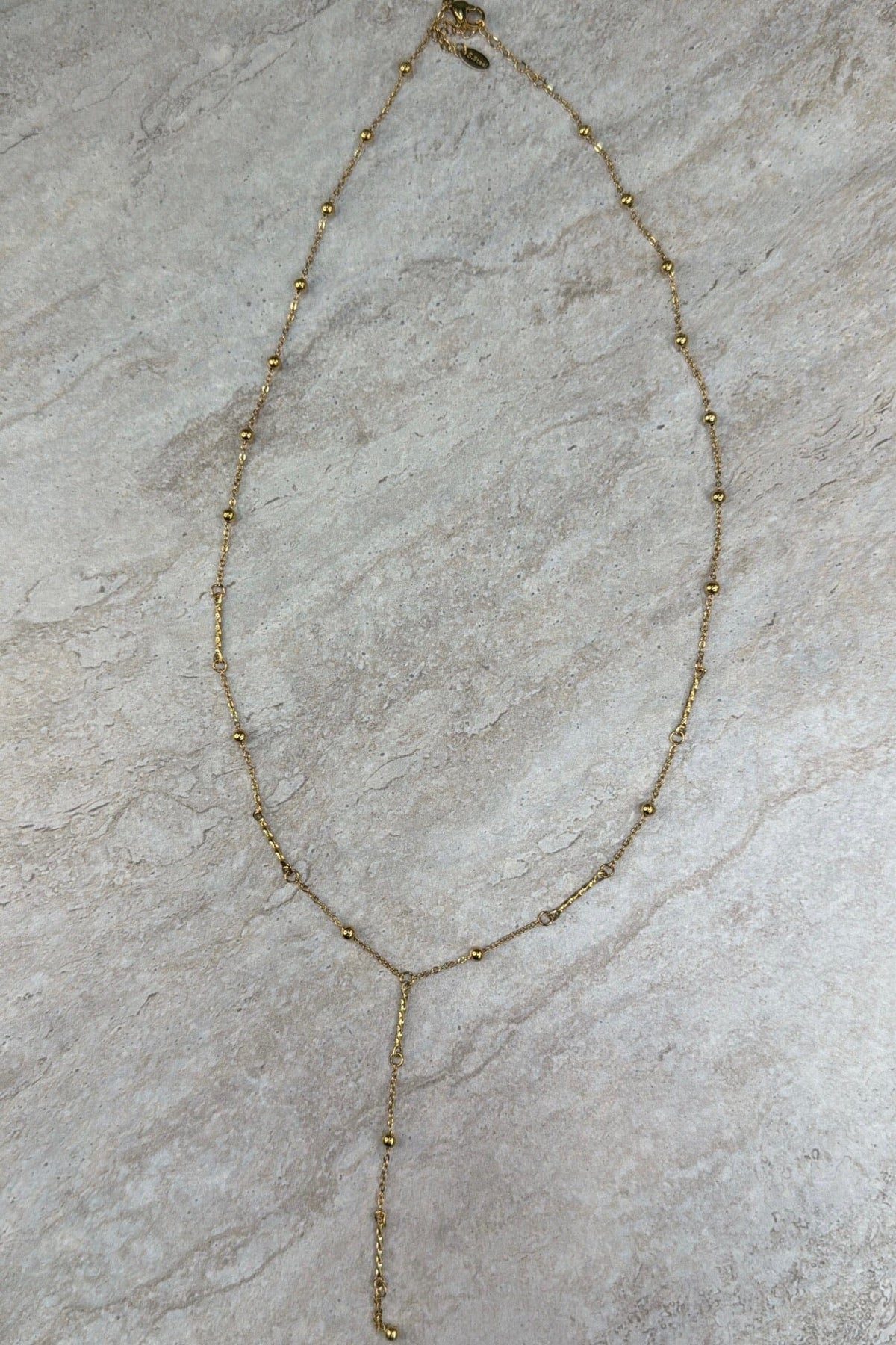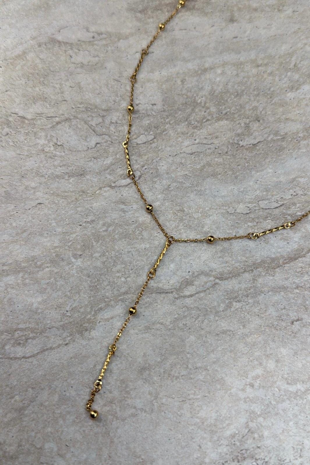 Guldförgylld halskedja från Molly&My Jewellery, tillverkad av rostfritt stål med små runda pärlor längs kedjan och en Y-formad hängesdel.