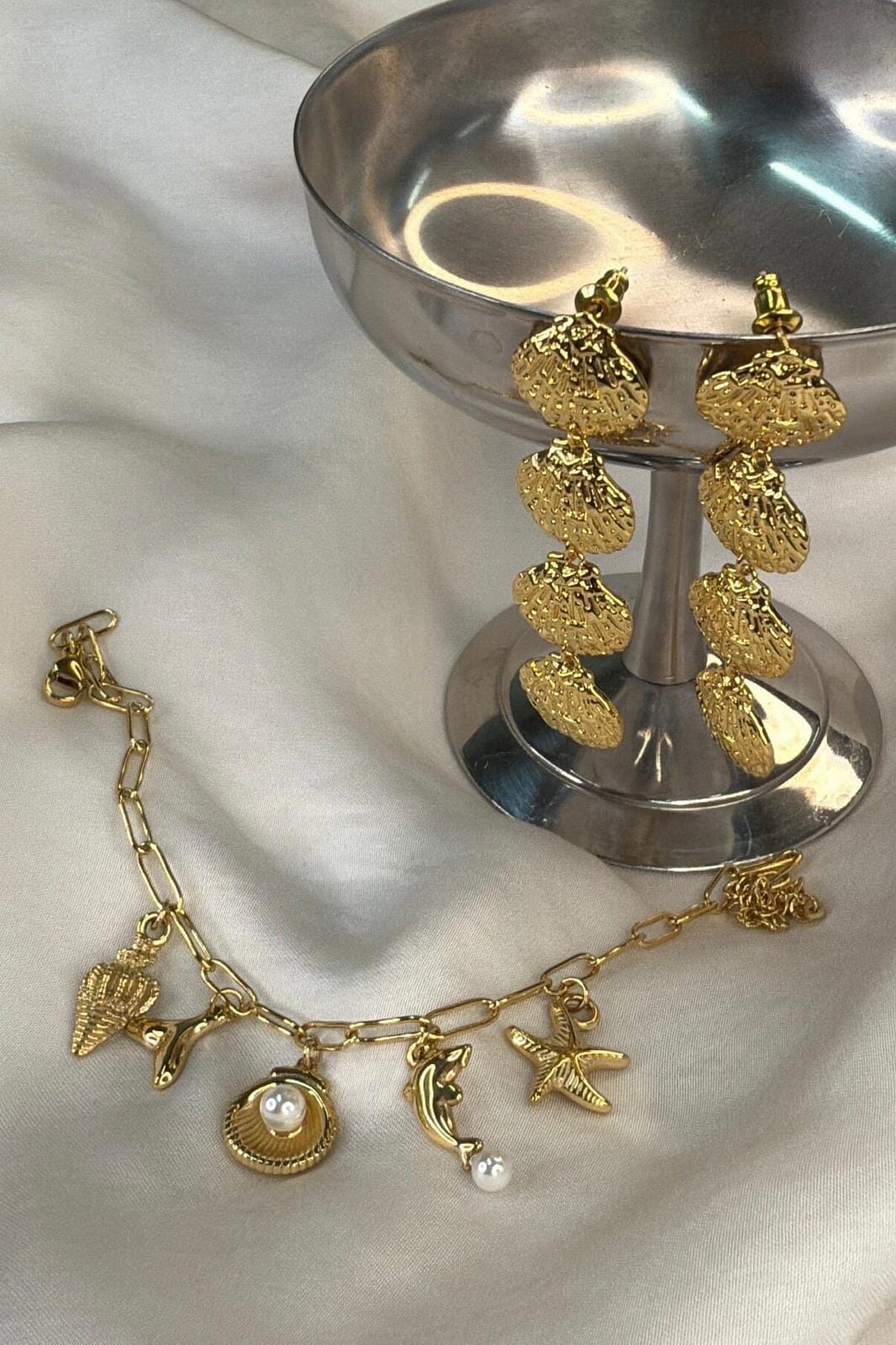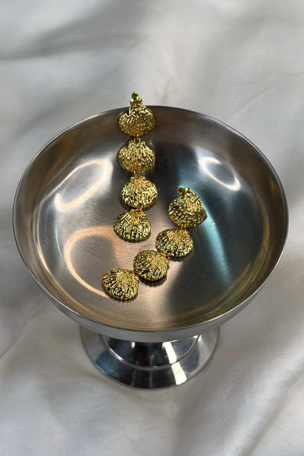 Förgyllda örhängen från Molly&My Jewellery med snäckformade hängen i en flerdelad design. Den gyllene färgen framhäver snäckformen och ger örhängena ett feminint uttryck.