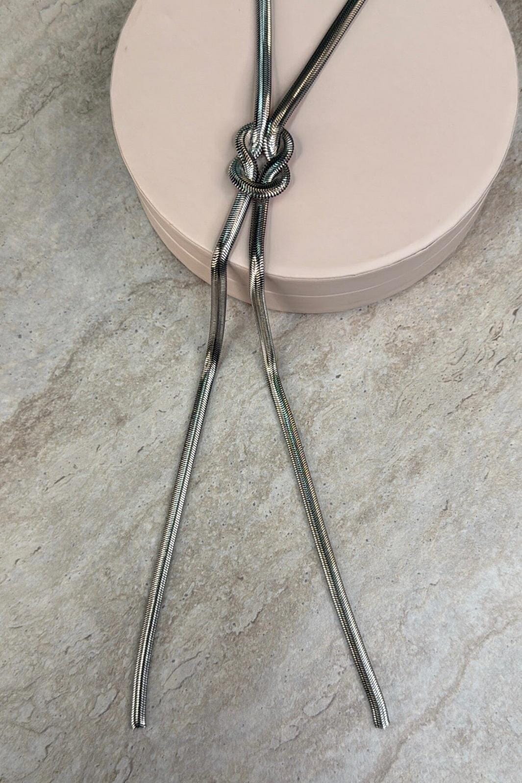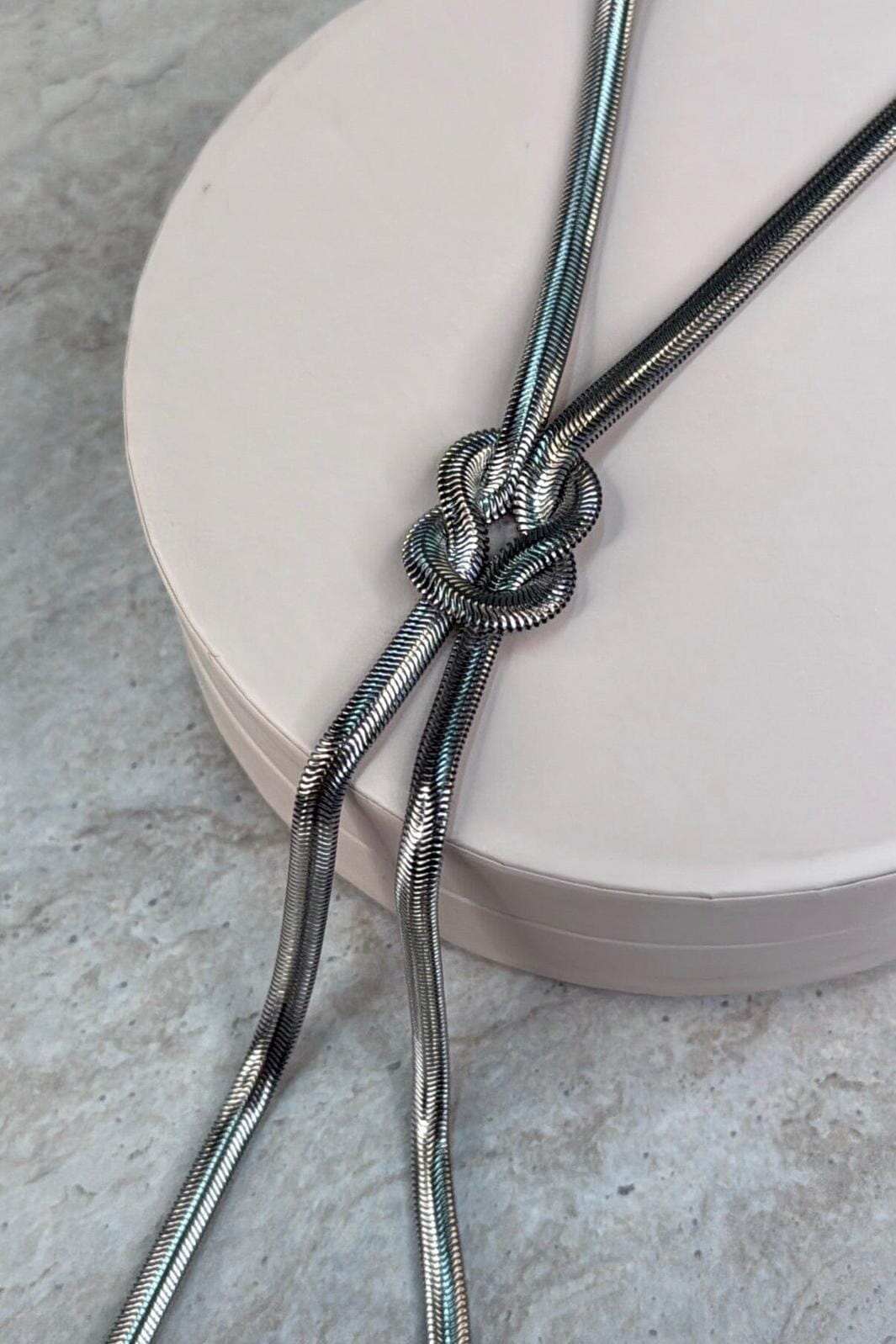 En försilvrad halskedja från Molly&My Jewellery med en knutdesign. Halskedjan har en glänsande yta och är tillverkad av rostfritt stål.