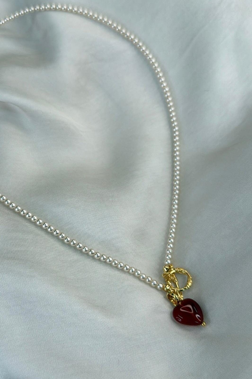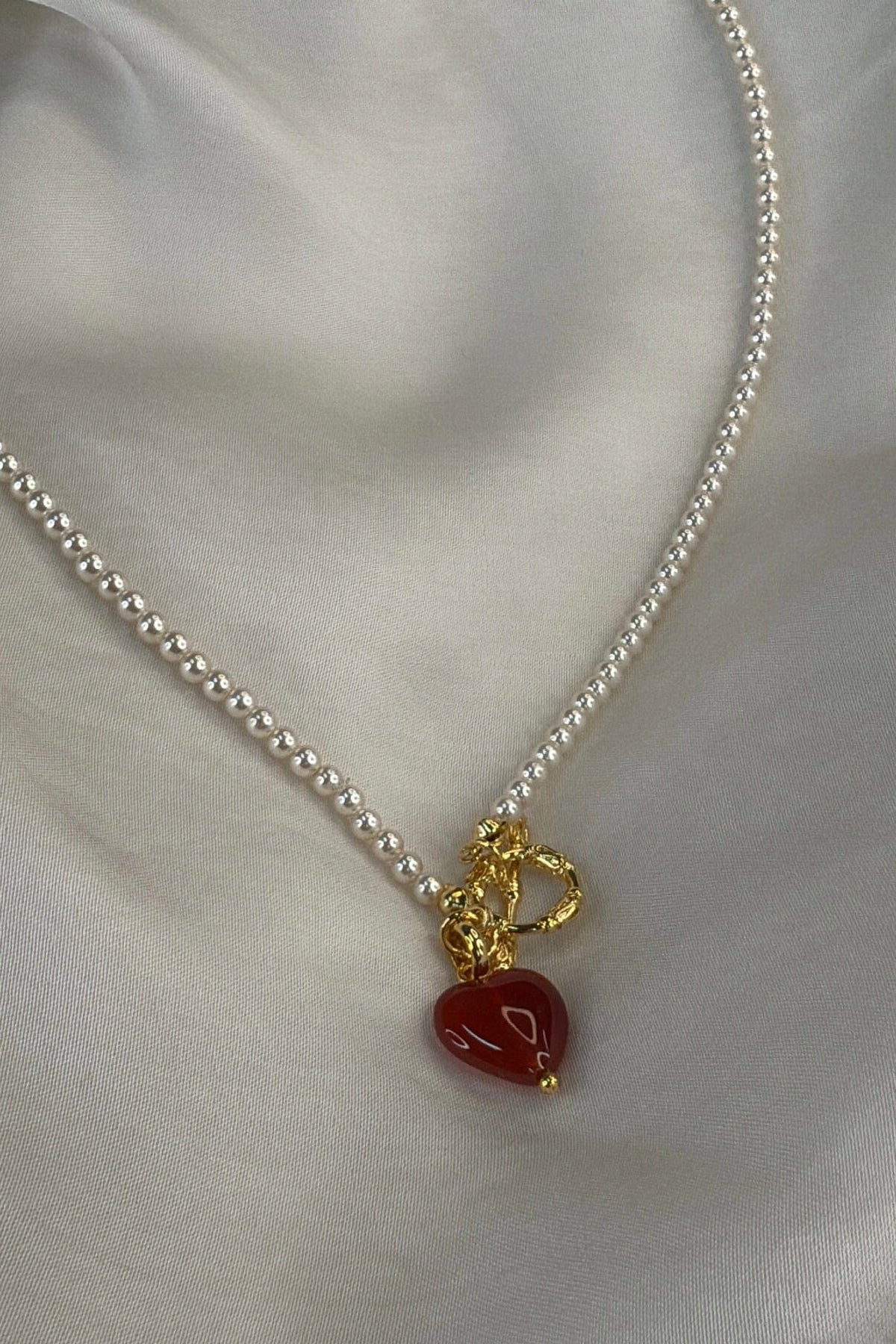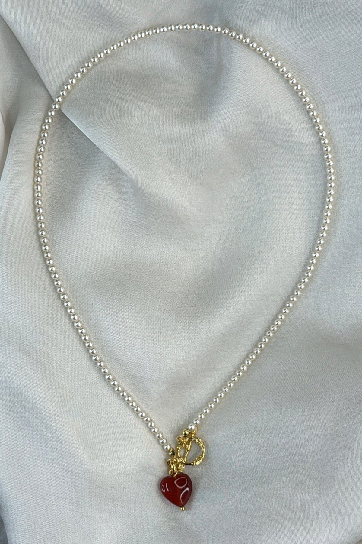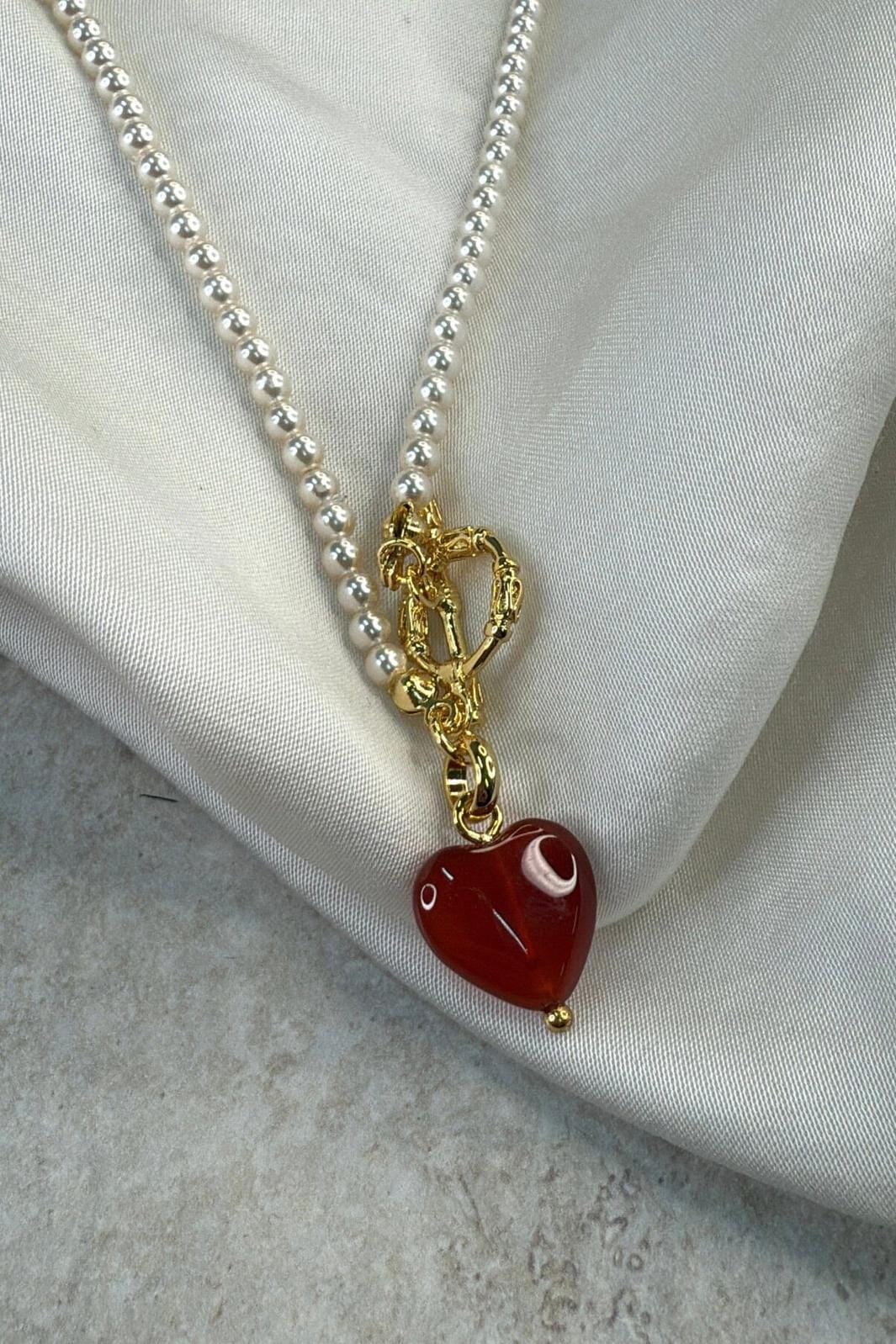 Förgylld halskedja från Molly&My Jewellery med små pärlliknande kulor, ett rött hjärtformat hänge och ett guldfärgat toggle-lås.