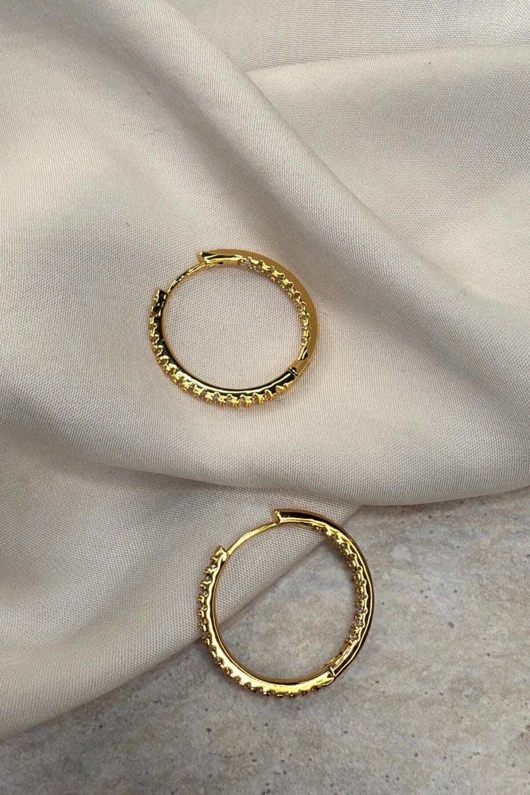 Förgyllda hoops från Molly&My Jewellery med små, klara stenar längs framsidan. Örhängena är tillverkade av mässing med en glänsande, gyllene yta.