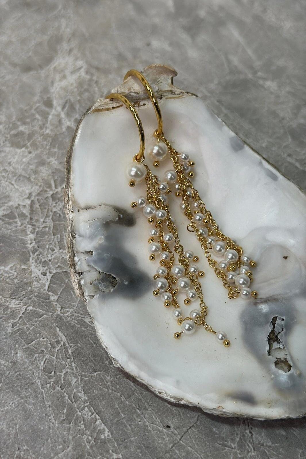 Förgyllda örhängen från Molly&My Jewellery x Melanie Due, tillverkade av rostfritt stål med hängen av kedjor och pärlor.