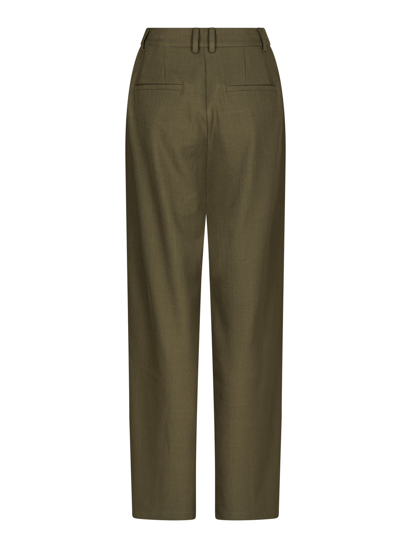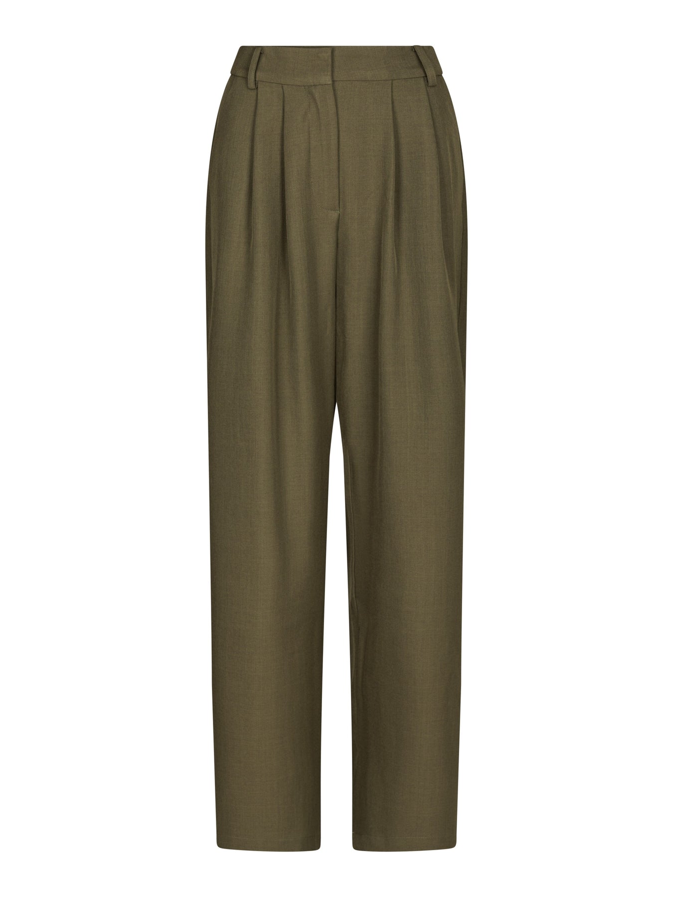 Kakifärgade byxor från Molly&My x Julie Elgaard med vida ben och en strukturerad passform. Byxorna har hög midja och golvlång längd.