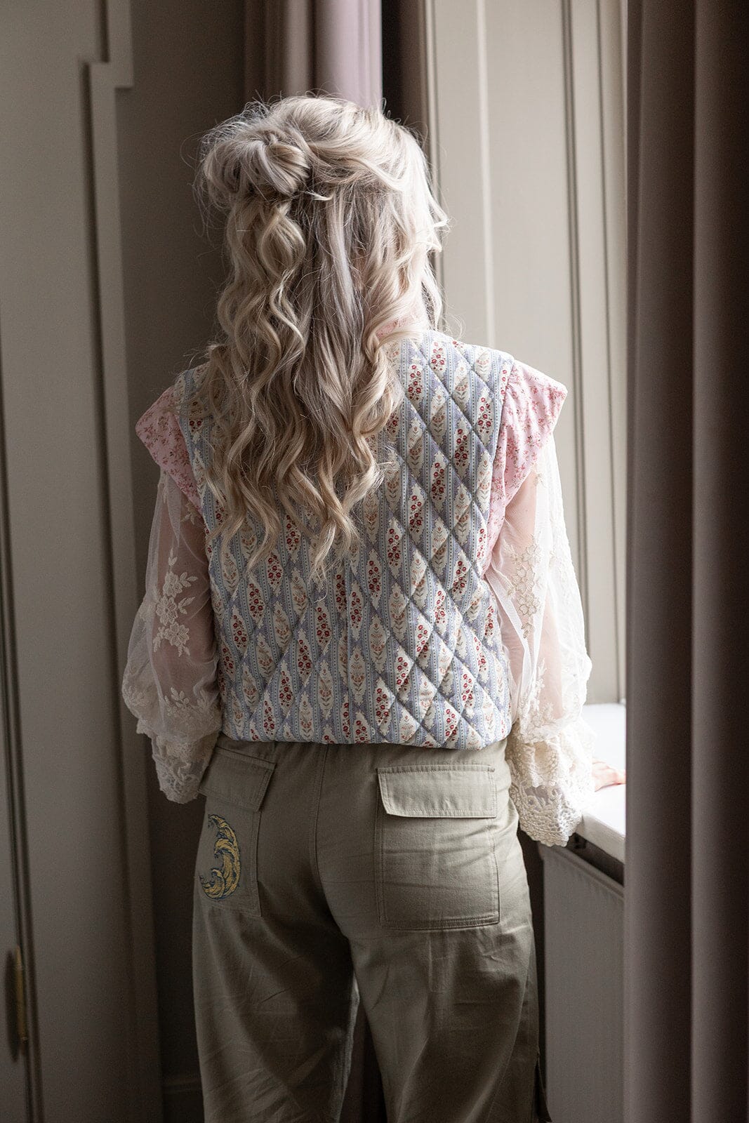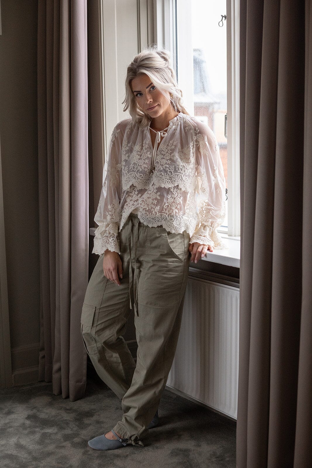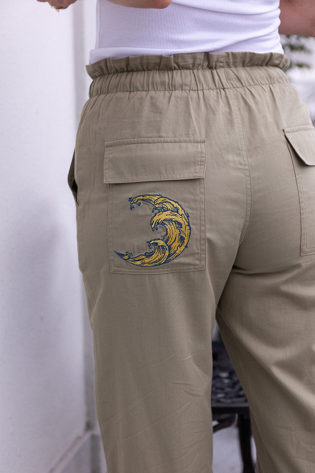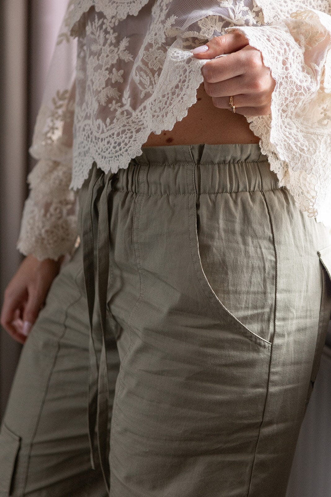 Lösa byxor från Molly & My X Melanie Due i en dämpad grön nyans. Byxorna har hög midja och golvlängd med detaljer som broderi och volanger.